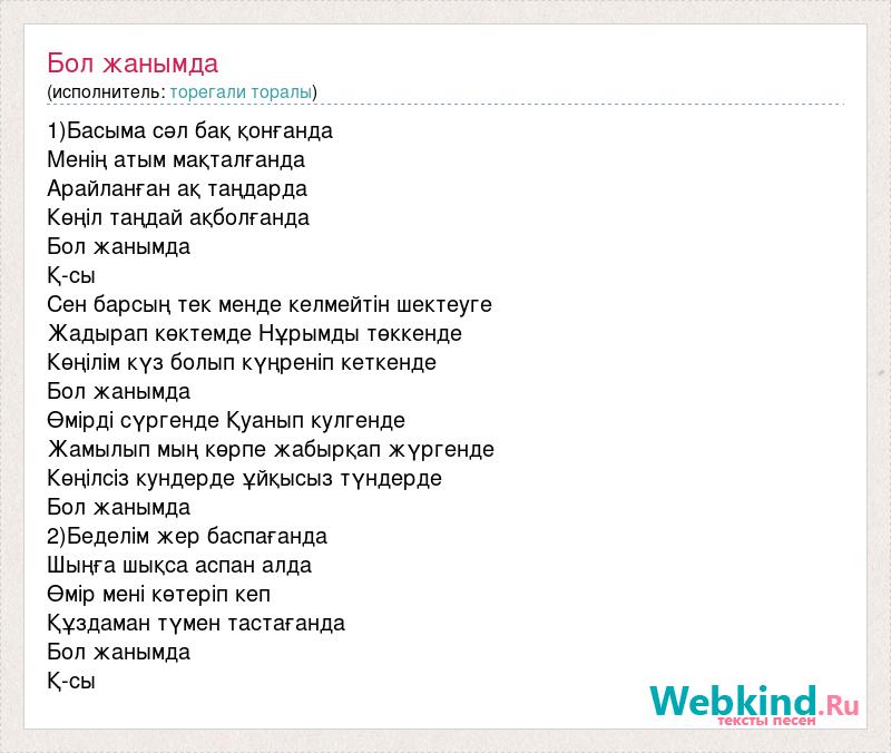 1)Басыма сәл бақ қонғанда Менің атым мақталғанда Арайланған ақ таңдарда Көңіл таңдай ақболғанда Бол жанымда Қ-сы Сен барсың тек менде келмейтін шектеуге Жадырап көктемде Нұрымды төккенде Көңілім күз болып күңреніп кеткенде Бол жанымда Өмірді сүргенде Қуанып кулгенде Жамылып мың көрпе жабырқап жүргенде Көңілсіз кундерде ұйқысыз түндерде Бол жанымда 2)Беделім жер баспағанда Шыңға шықса аспан алда Өмір мені көтеріп кеп Құздаман түмен тастағанда Бол жанымда Қ-сы