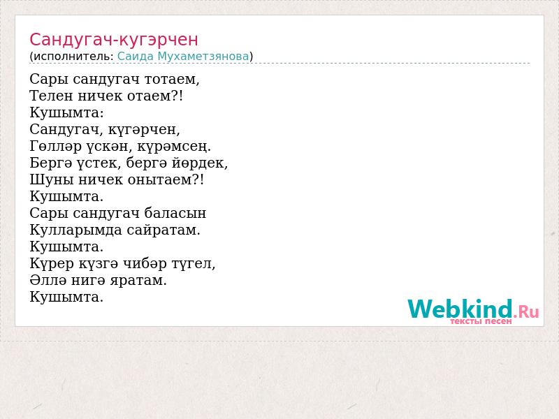 Сары сандугач тотаем, Телен ничек отаем?! Кушымта: Сандугач, күгәрчен, Гөлләр үскән, күрәмсең. Бергә үстек, бергә йөрдек, Шуны ничек онытаем?! Кушымта. Сары сандугач баласын Кулларымда сайратам. Кушымта. Күрер күзгә чибәр түгел, Әллә нигә яратам. Кушымта.