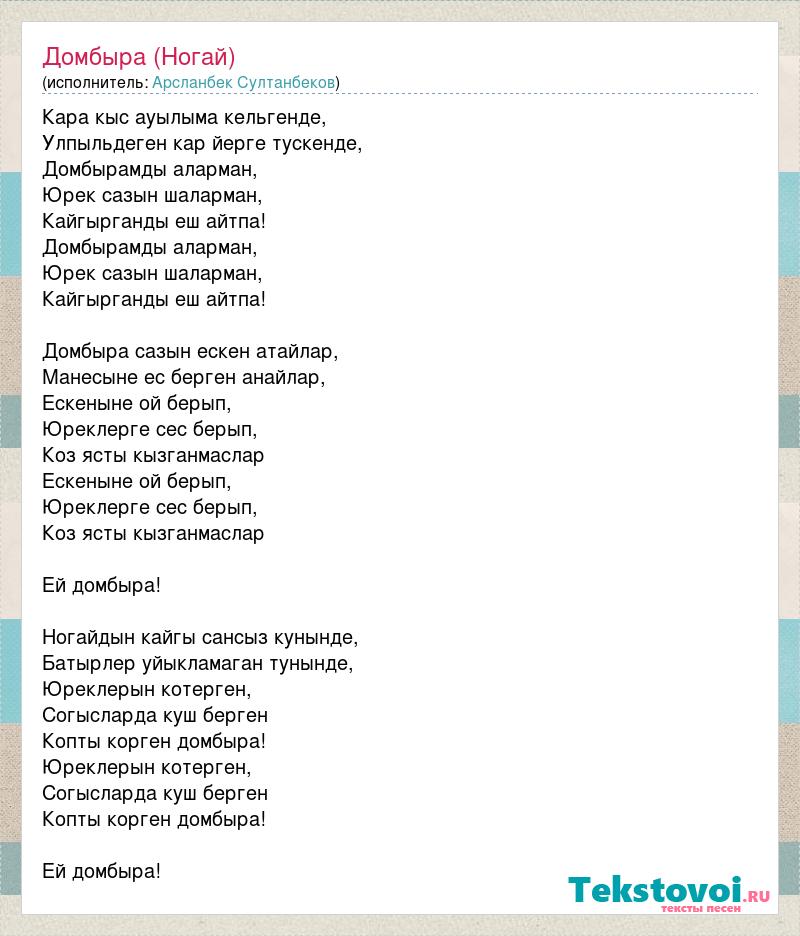 Кара кыс ауылыма кельгенде, Улпыльдеген кар йерге тускенде, Домбырамды аларман, Юрек сазын шаларман, Кайгырганды еш айтпа! Домбырамды аларман, Юрек сазын шаларман, Кайгырганды еш айтпа! Домбыра сазын ескен атайлар, Манесыне ес берген анайлар, Ескеныне ой берып, Юреклерге сес берып, Коз ясты кызганмаслар Ескеныне ой берып, Юреклерге сес берып, Коз ясты кызганмаслар Ей домбыра! Ногайдын кайгы сансыз кунынде, Батырлер уйыкламаган тунынде, Юреклерын котерген, Согысларда куш берген Копты корген домбыра! Юреклерын котерген, Согысларда куш берген Копты корген домбыра! Ей домбыра!
