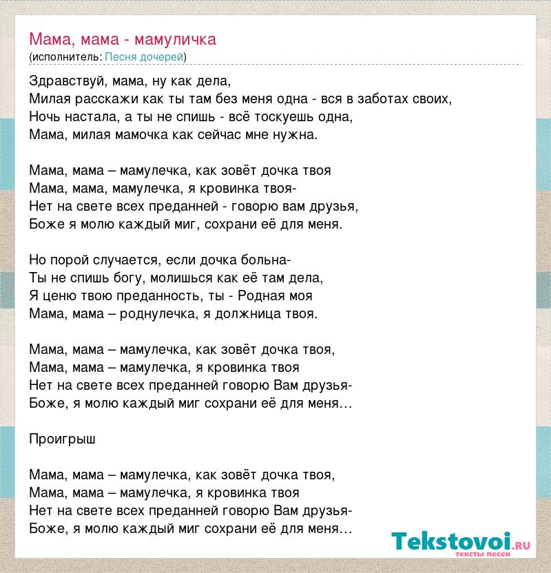 Здравствуй, мама, ну как дела, Милая расскажи как ты там без меня одна - вся в заботах своих, Ночь настала, а ты не спишь - всё тоскуешь одна, Мама, милая мамочка как сейчас мне нужна. Мама, мама – мамулечка, как зовёт дочка твоя Мама, мама, мамулечка, я кровинка твоя- Нет на свете всех преданней - говорю вам друзья, Боже я молю каждый миг, сохрани её для меня. Но порой случается, если дочка больна- Ты не спишь богу, молишься как её там дела, Я ценю твою преданность, ты - Родная моя Мама, мама – роднулечка, я должница твоя. Мама, мама – мамулечка, как зовёт дочка твоя, Мама, мама – мамулечка, я кровинка твоя Нет на свете всех преданней говорю Вам друзья- Боже, я молю каждый миг сохрани её для меня… Проигрыш Мама, мама – мамулечка, как зовёт дочка твоя, Мама, мама – мамулечка, я кровинка твоя Нет на свете всех преданней говорю Вам друзья- Боже, я молю каждый миг сохрани её для меня…