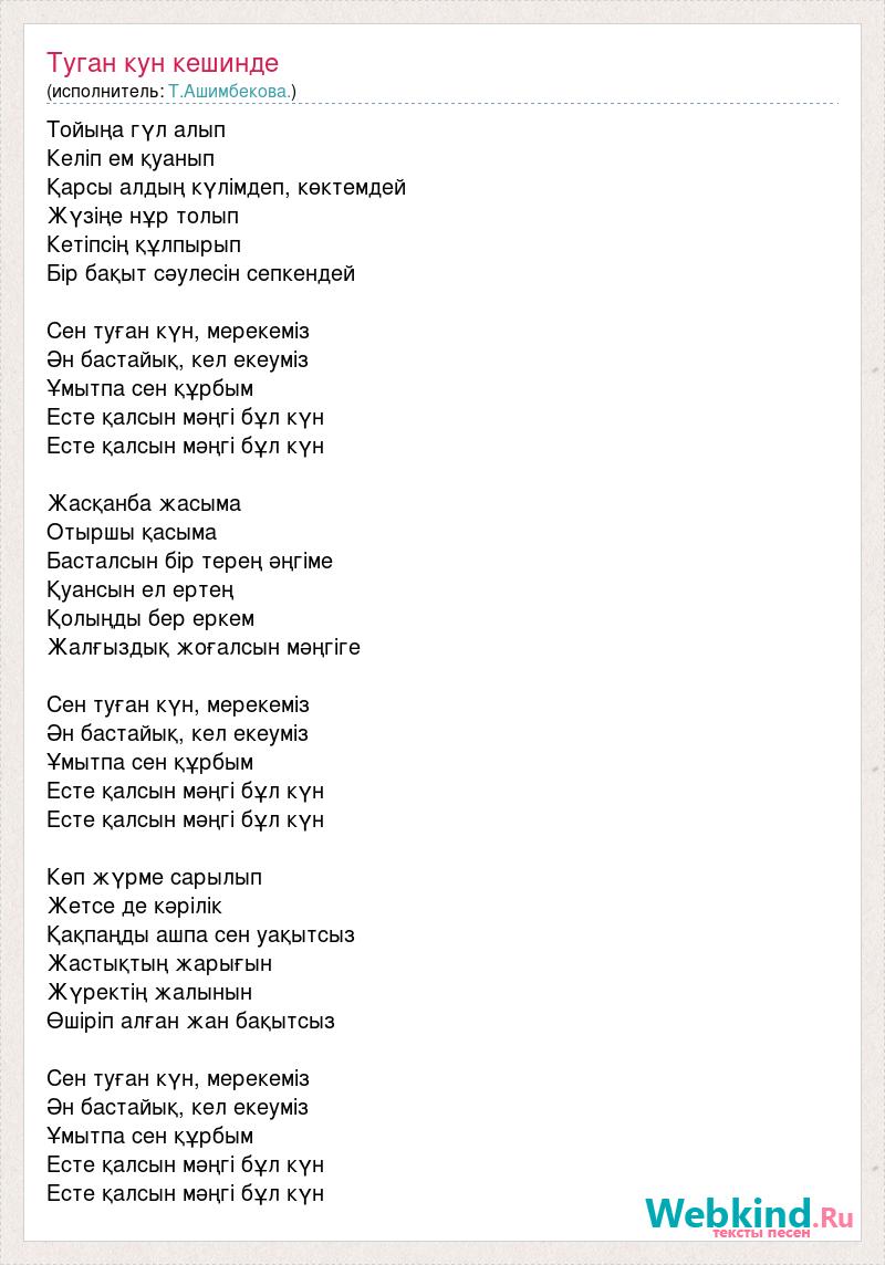 Тойыңа гүл алып Келіп ем қуанып Қарсы алдың күлімдеп, көктемдей Жүзіңе нұр толып Кетіпсің құлпырып Бір бақыт сәулесін сепкендей Сен туған күн, мерекеміз Ән бастайық, кел екеуміз Ұмытпа сен құрбым Есте қалсын мәңгі бұл күн Есте қалсын мәңгі бұл күн Жасқанба жасыма Отыршы қасыма Басталсын бір терең әңгіме Қуансын ел ертең Қолыңды бер еркем Жалғыздық жоғалсын мәңгіге Сен туған күн, мерекеміз Ән бастайық, кел екеуміз Ұмытпа сен құрбым Есте қалсын мәңгі бұл күн Есте қалсын мәңгі бұл күн Көп жүрме сарылып Жетсе де кәрілік Қақпаңды ашпа сен уақытсыз Жастықтың жарығын Жүректің жалынын Өшіріп алған жан бақытсыз Сен туған күн, мерекеміз Ән бастайық, кел екеуміз Ұмытпа сен құрбым Есте қалсын мәңгі бұл күн Есте қалсын мәңгі бұл күн
