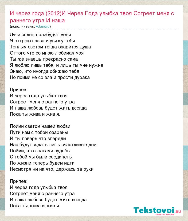 Лучи солнца разбудят меня Я открою глаза и увижу тебя Теплым светом тогда озарится душа Оттого что со мною любимая моя Ты же знаешь прекрасно сама Я люблю лишь тебя, и лишь ты мне нужна Знаю, что иногда обижаю тебя Но пойми не со зла и прости дурака Припев: И через года улыбка твоя Согреет меня с раннего утра И наша любовь будет жить всегда Пока ты жива и жив я. Пойми светом нашей любви Пути нам с тобой озарены И ты поверь что впереди Нас будут ждать лишь счастливые дни Пойми, что знаками судьбы С тобой мы были соединены По жизни теперь будем идти Несмотря ни на что, держась за руки Припев: И через года улыбка твоя Согреет меня с раннего утра И наша любовь будет жить всегда Пока ты жива и жив я.