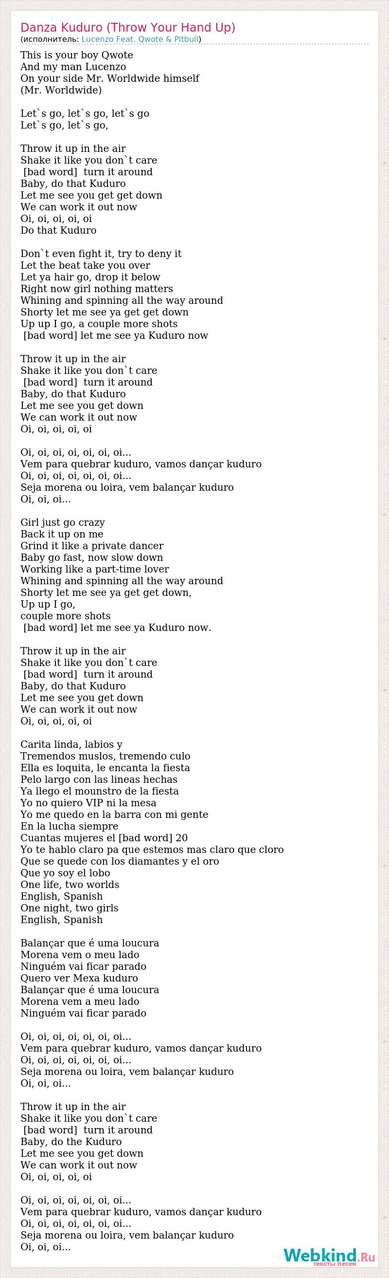 This is your boy Qwote And my man Lucenzo On your side Mr. Worldwide himself (Mr. Worldwide) Let`s go, let`s go, let`s go Let`s go, let`s go, Throw it up in the air Shake it like you don`t care [bad word] turn it around Baby, do that Kuduro Let me see you get get down We can work it out now Oi, oi, oi, oi, oi Do that Kuduro Don`t even fight it, try to deny it Let the beat take you over Let ya hair go, drop it below Right now girl nothing matters Whining and spinning all the way around Shorty let me see ya get get down Up up I go, a couple more shots [bad word] let me see ya Kuduro now Throw it up in the air Shake it like you don`t care [bad word] turn it around Baby, do that Kuduro Let me see you get down We can work it out now Oi, oi, oi, oi, oi Oi, oi, oi, oi, oi, oi, oi... Vem para quebrar kuduro, vamos dançar kuduro Oi, oi, oi, oi, oi, oi, oi... Seja morena ou loira, vem balançar kuduro Oi, oi, oi... Girl just go crazy Back it up on me Grind it like a private dancer Baby go fast, now slow down Working like a part-time lover Whining and spinning all the way around Shorty let me see ya get get down, Up up I go, couple more shots [bad word] let me see ya Kuduro now. Throw it up in the air Shake it like you don`t care [bad word] turn it around Baby, do that Kuduro Let me see you get down We can work it out now Oi, oi, oi, oi, oi Carita linda, labios y Tremendos muslos, tremendo culo Ella es loquita, le encanta la fiesta Pelo largo con las lineas hechas Ya llego el mounstro de la fiesta Yo no quiero VIP ni la mesa Yo me quedo en la barra con mi gente En la lucha siempre Cuantas mujeres el [bad word] 20 Yo te hablo claro pa que estemos mas claro que cloro Que se quede con los diamantes y el oro Que yo soy el lobo One life, two worlds English, Spanish One night, two girls English, Spanish Balançar que é uma loucura Morena vem o meu lado Ninguém vai ficar parado Quero ver Mexa kuduro Balançar que é uma loucura Morena vem a meu lado Ninguém vai ficar parado Oi, oi, oi, oi, oi, oi, oi... Vem para quebrar kuduro, vamos dançar kuduro Oi, oi, oi, oi, oi, oi, oi... Seja morena ou loira, vem balançar kuduro Oi, oi, oi... Throw it up in the air Shake it like you don`t care [bad word] turn it around Baby, do the Kuduro Let me see you get down We can work it out now Oi, oi, oi, oi, oi Oi, oi, oi, oi, oi, oi, oi... Vem para quebrar kuduro, vamos dançar kuduro Oi, oi, oi, oi, oi, oi, oi... Seja morena ou loira, vem balançar kuduro Oi, oi, oi...