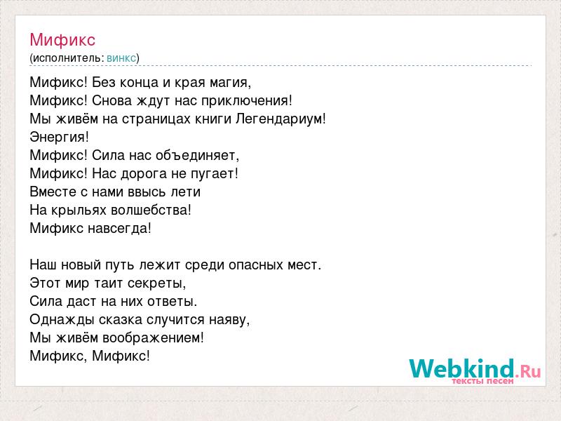 Мификс! Без конца и края магия, Мификс! Снова ждут нас приключения! Мы живём на страницах книги Легендариум! Энергия! Мификс! Сила нас объединяет, Мификс! Нас дорога не пугает! Вместе с нами ввысь лети На крыльях волшебства! Мификс навсегда! Наш новый путь лежит среди опасных мест. Этот мир таит секреты, Сила даст на них ответы. Однажды сказка случится наяву, Мы живём воображением! Мификс, Мификс!