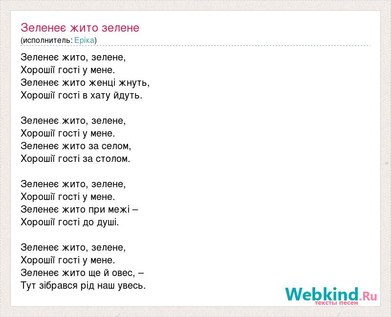 Зеленеє жито, зелене, Хорошії гості у мене. Зеленеє жито женці жнуть, Хорошії гості в хату йдуть. Зеленеє жито, зелене, Хорошії гості у мене. Зеленеє жито за селом, Хорошії гості за столом. Зеленеє жито, зелене, Хорошії гості у мене. Зеленеє жито при межі – Хорошії гості до душі. Зеленеє жито, зелене, Хорошії гості у мене. Зеленеє жито ще й овес, – Тут зібрався рід наш увесь.