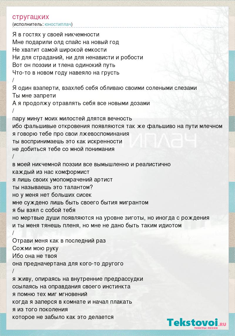 Я в гостях у своей никчемности Мне подарили олд спайс на новый год Не хватит самой широкой емкости Ни для страданий, ни для ненависти и робости Вот он поэзии и тлена одинокий путь Что-то в новом году навеяло на грусть / Я один взаперти, взахлеб себя обливаю своими солеными слезами Ты мне запрети А я продолжу отравлять себя все новыми дозами / пару минут моих милостей длятся вечность ибо фальшивые откровения появляются так же фальшиво на пути млечном я говорю тебе про свои лжевоспоминания ты воспринимаешь это как искренности не добиться тебе со мной понимания / в моей никчемной поэзии все вымышленно и реалистично каждый из нас комформист я лишь своих умопомрачений артист ты называешь это талантом? но у меня нет больших сисек мне суждено лишь быть своего бытия мигрантом я бы взял с собой тебя но мертвые души появляются на уровне зиготы, но иногда с рождения и ты меня тянешь пленя, но мне не дано быть таким идиотом / Отрави меня как в последний раз Сожми мою руку Ибо она не твоя она предначертана для кого-то другого / я живу, опираясь на внутренние предрассудки ссылаясь на оправдания своего инстинкта я помню тех миг мгновений когда я заперся в комнате и начал плакать я из того поколения которое не забыло как это делается