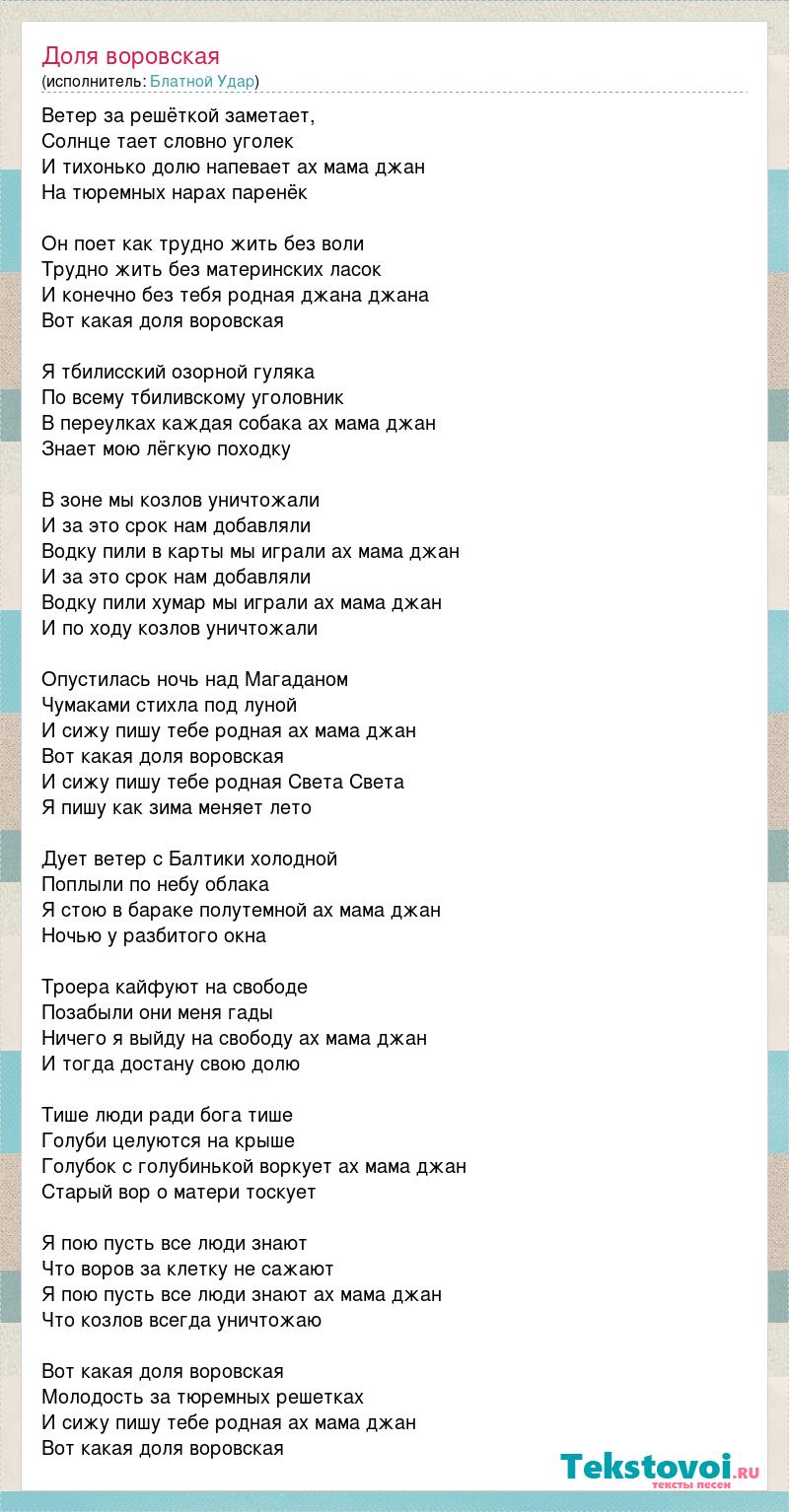 Ветер за решёткой заметает, Солнце тает словно уголек И тихонько долю напевает ах мама джан На тюремных нарах паренёк Он поет как трудно жить без воли Трудно жить без материнских ласок И конечно без тебя родная джана джана Вот какая доля воровская Я тбилисский озорной гуляка По всему тбиливскому уголовник В переулках каждая собака ах мама джан Знает мою лёгкую походку В зоне мы козлов уничтожали И за это срок нам добавляли Водку пили в карты мы играли ах мама джан И за это срок нам добавляли Водку пили хумар мы играли ах мама джан И по ходу козлов уничтожали Опустилась ночь над Магаданом Чумаками стихла под луной И сижу пишу тебе родная ах мама джан Вот какая доля воровская И сижу пишу тебе родная Света Света Я пишу как зима меняет лето Дует ветер с Балтики холодной Поплыли по небу облака Я стою в бараке полутемной ах мама джан Ночью у разбитого окна Троера кайфуют на свободе Позабыли они меня гады Ничего я выйду на свободу ах мама джан И тогда достану свою долю Тише люди ради бога тише Голуби целуются на крыше Голубок с голубинькой воркует ах мама джан Старый вор о матери тоскует Я пою пусть все люди знают Что воров за клетку не сажают Я пою пусть все люди знают ах мама джан Что козлов всегда уничтожаю Вот какая доля воровская Молодость за тюремных решетках И сижу пишу тебе родная ах мама джан Вот какая доля воровская