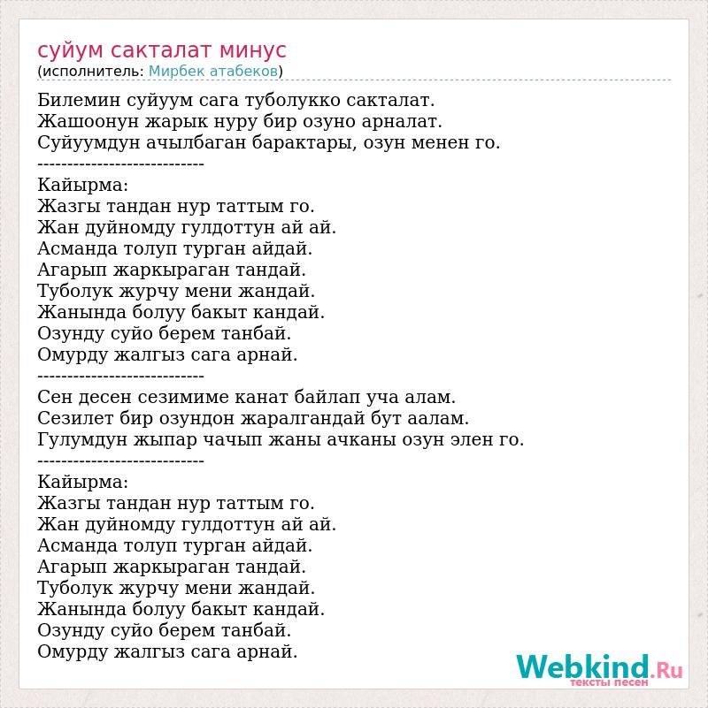 Билемин суйуум сага туболукко сакталат. Жашоонун жарык нуру бир озуно арналат. Суйуумдун ачылбаган барактары, озун менен го. ---------------------------- Кайырма: Жазгы тандан нур таттым го. Жан дуйномду гулдоттун ай ай. Асманда толуп турган айдай. Агарып жаркыраган тандай. Туболук журчу мени жандай. Жанында болуу бакыт кандай. Озунду суйо берем танбай. Омурду жалгыз сага арнай. ---------------------------- Сен десен сезимиме канат байлап уча алам. Сезилет бир озундон жаралгандай бут аалам. Гулумдун жыпар чачып жаны ачканы озун элен го. ---------------------------- Кайырма: Жазгы тандан нур таттым го. Жан дуйномду гулдоттун ай ай. Асманда толуп турган айдай. Агарып жаркыраган тандай. Туболук журчу мени жандай. Жанында болуу бакыт кандай. Озунду суйо берем танбай. Омурду жалгыз сага арнай.