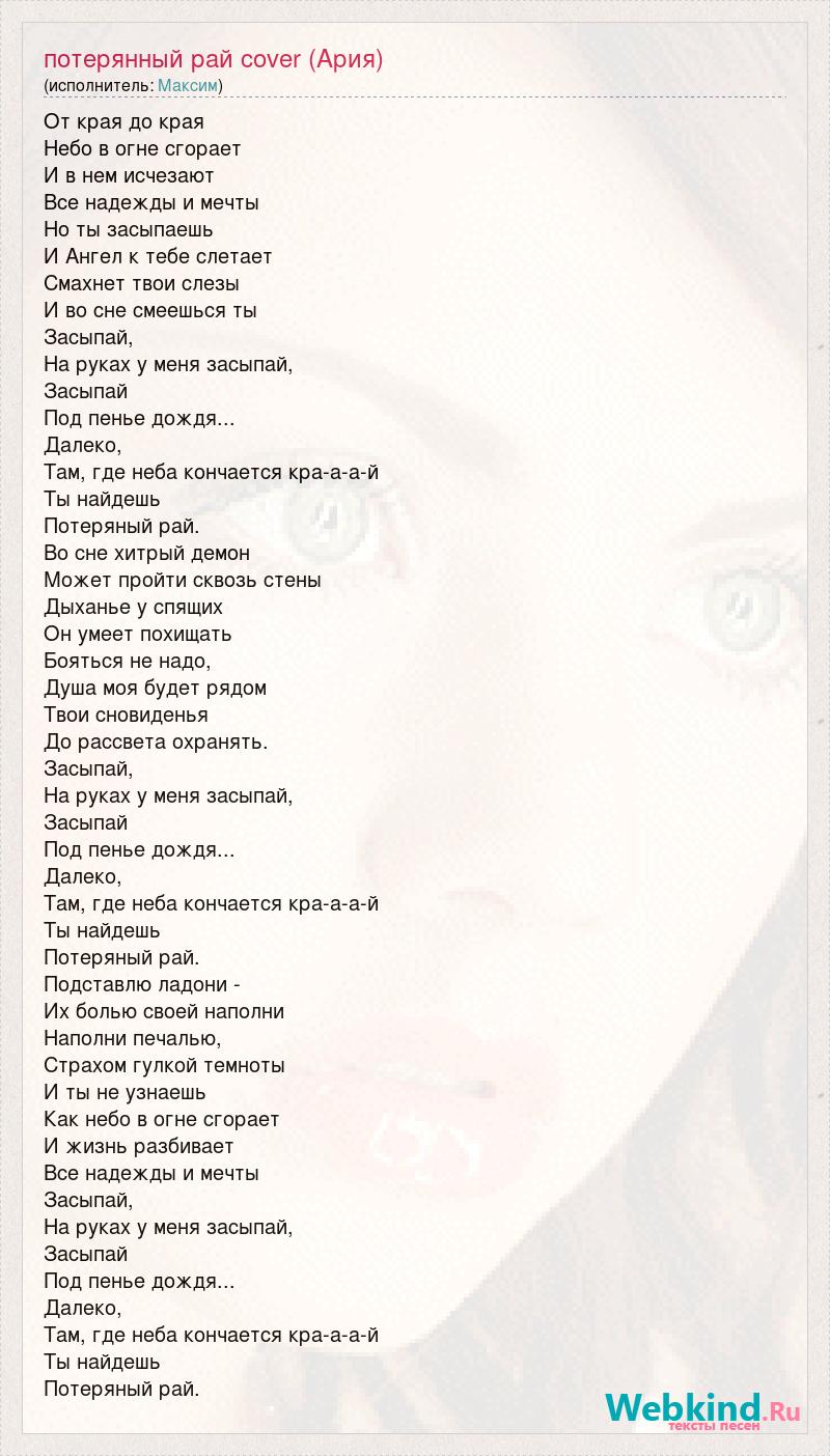 От края до края Небо в огне сгорает И в нем исчезают Все надежды и мечты Но ты засыпаешь И Ангел к тебе слетает Смахнет твои слезы И во сне смеешься ты Засыпай, На руках у меня засыпай, Засыпай Под пенье дождя... Далеко, Там, где неба кончается кра-а-а-й Ты найдешь Потеряный рай. Во сне хитрый демон Может пройти сквозь стены Дыханье у спящих Он умеет похищать Бояться не надо, Душа моя будет рядом Твои сновиденья До рассвета охранять. Засыпай, На руках у меня засыпай, Засыпай Под пенье дождя... Далеко, Там, где неба кончается кра-а-а-й Ты найдешь Потеряный рай. Подставлю ладони - Их болью своей наполни Наполни печалью, Cтрахом гулкой темноты И ты не узнаешь Как небо в огне сгорает И жизнь разбивает Все надежды и мечты Засыпай, На руках у меня засыпай, Засыпай Под пенье дождя... Далеко, Там, где неба кончается кра-а-а-й Ты найдешь Потеряный рай.