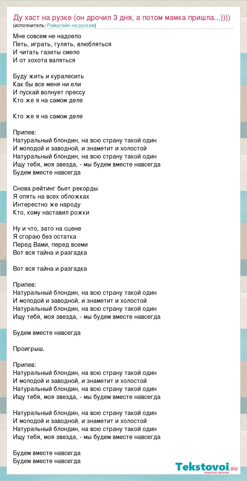 Мне совсем не надоело Петь, играть, гулять, влюбляться И читать газеты смело И от хохота валяться Буду жить и куралесить Как бы все меня ни ели И пускай волнует прессу Кто же я на самом деле Кто же я на самом деле Припев: Натуральный блондин, на всю страну такой один И молодой и заводной, и знаметит и холостой Натуральный блондин, на всю страну такой один Ищу тебя, моя звезда, - мы будем вместе навсегда Будем вместе навсегда Снова рейтинг бьет рекорды Я опять на всех обложках Интерестно же народу Кто, кому наставил рожки Ну и что, зато на сцене Я сгораю без остатка Перед Вами, перед всеми Вот вся тайна и разгадка Вот вся тайна и разгадка Припев: Натуральный блондин, на всю страну такой один И молодой и заводной, и знаметит и холостой Натуральный блондин, на всю страну такой один Ищу тебя, моя звезда, - мы будем вместе навсегда Будем вместе навсегда Проигрыш. Припев: Натуральный блондин, на всю страну такой один И молодой и заводной, и знаметит и холостой Натуральный блондин, на всю страну такой один Ищу тебя, моя звезда, - мы будем вместе навсегда Натуральный блондин, на всю страну такой один И молодой и заводной, и знаметит и холостой Натуральный блондин, на всю страну такой один Ищу тебя, моя звезда, - мы будем вместе навсегда Будем вместе навсегда Будем вместе навсегда