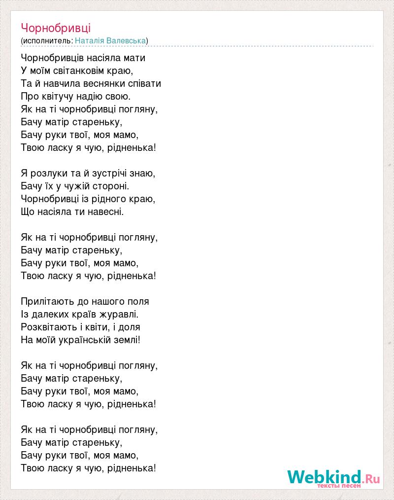 Чорнобривців насіяла мати У моїм світанковім краю, Та й навчила веснянки співати Про квітучу надію свою. Як на ті чорнобривці погляну, Бачу матір стареньку, Бачу руки твої, моя мамо, Твою ласку я чую, рідненька! Я розлуки та й зустрічі знаю, Бачу їх у чужій стороні. Чорнобривці із рідного краю, Що насіяла ти навесні. Як на ті чорнобривці погляну, Бачу матір стареньку, Бачу руки твої, моя мамо, Твою ласку я чую, рідненька! Прилітають до нашого поля Із далеких країв журавлі. Розквітають і квіти, і доля На моїй українській землі! Як на ті чорнобривці погляну, Бачу матір стареньку, Бачу руки твої, моя мамо, Твою ласку я чую, рідненька! Як на ті чорнобривці погляну, Бачу матір стареньку, Бачу руки твої, моя мамо, Твою ласку я чую, рідненька!