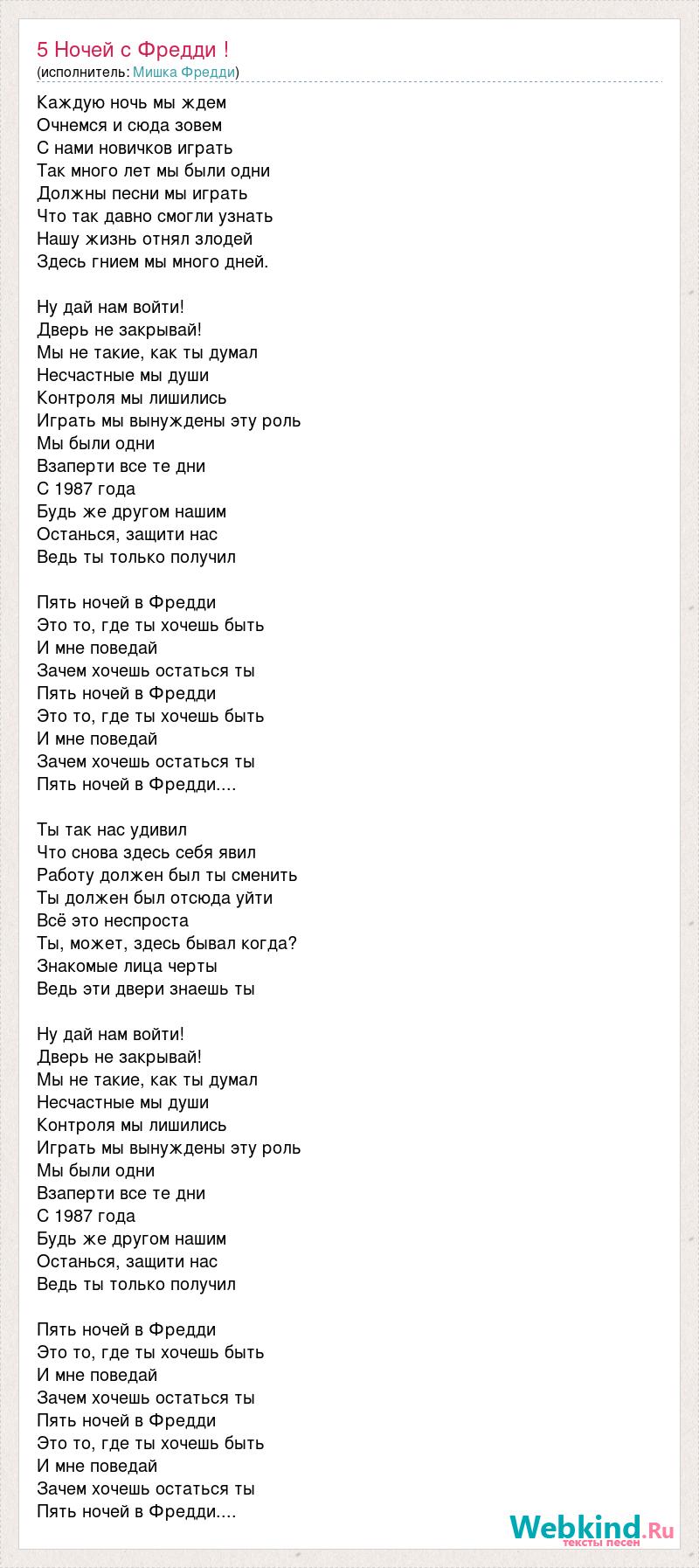 Каждую ночь мы ждем Очнемся и сюда зовем С нами новичков играть Так много лет мы были одни Должны песни мы играть Что так давно смогли узнать Нашу жизнь отнял злодей Здесь гнием мы много дней. Ну дай нам войти! Дверь не закрывай! Мы не такие, как ты думал Несчастные мы души Контроля мы лишились Играть мы вынуждены эту роль Мы были одни Взаперти все те дни С 1987 года Будь же другом нашим Останься, защити нас Ведь ты только получил Пять ночей в Фредди Это то, где ты хочешь быть И мне поведай Зачем хочешь остаться ты Пять ночей в Фредди Это то, где ты хочешь быть И мне поведай Зачем хочешь остаться ты Пять ночей в Фредди.... Ты так нас удивил Что снова здесь себя явил Работу должен был ты сменить Ты должен был отсюда уйти Всё это неспроста Ты, может, здесь бывал когда? Знакомые лица черты Ведь эти двери знаешь ты Ну дай нам войти! Дверь не закрывай! Мы не такие, как ты думал Несчастные мы души Контроля мы лишились Играть мы вынуждены эту роль Мы были одни Взаперти все те дни С 1987 года Будь же другом нашим Останься, защити нас Ведь ты только получил Пять ночей в Фредди Это то, где ты хочешь быть И мне поведай Зачем хочешь остаться ты Пять ночей в Фредди Это то, где ты хочешь быть И мне поведай Зачем хочешь остаться ты Пять ночей в Фредди....