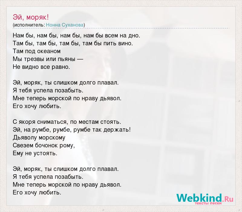 Нам бы, нам бы, нам бы, нам бы всем на дно. Там бы, там бы, там бы, там бы пить вино. Там под океаном Мы трезвы или пьяны — Не видно все равно. Эй, моряк, ты слишком долго плавал. Я тебя успела позабыть. Мне теперь морской по нраву дьявол. Его хочу любить. С якоря сниматься, по местам стоять. Эй, на румбе, румбе, румбе так держать! Дьяволу морскому Свезем бочонок рому, Ему не устоять. Эй, моряк, ты слишком долго плавал. Я тебя успела позабыть. Мне теперь морской по нраву дьявол. Его хочу любить.