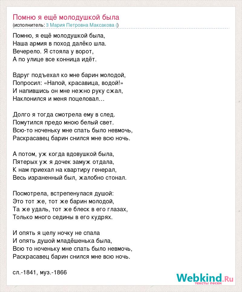 Помню, я ещё молодушкой была, Наша армия в поход далёко шла. Вечерело. Я стояла у ворот, А по улице все конница идёт. Вдруг подъехал ко мне барин молодой, Попросил: «Напой, красавица, водой!» И напившись он мне нежно руку сжал, Наклонился и меня поцеловал… Долго я тогда смотрела ему в след. Помутился предо мною белый свет. Всю-то ноченьку мне спать было невмочь, Раскрасавец барин снился мне всю ночь. А потом, уж когда вдовушкой была, Пятерых уж я дочек замуж отдала, К нам приехал на квартиру генерал, Весь израненный был, жалобно стонал. Посмотрела, встрепенулася душой: Это тот же, тот же барин молодой, Та же удаль, тот же блеск в его глазах, Только много седины в его кудрях. И опять я целу ночку не спала И опять душой младёшенька была, Всю то ноченьку мне спать было невмочь, Раскрасавец барин снился мне всю ночь. сл.-1841, муз.-1866