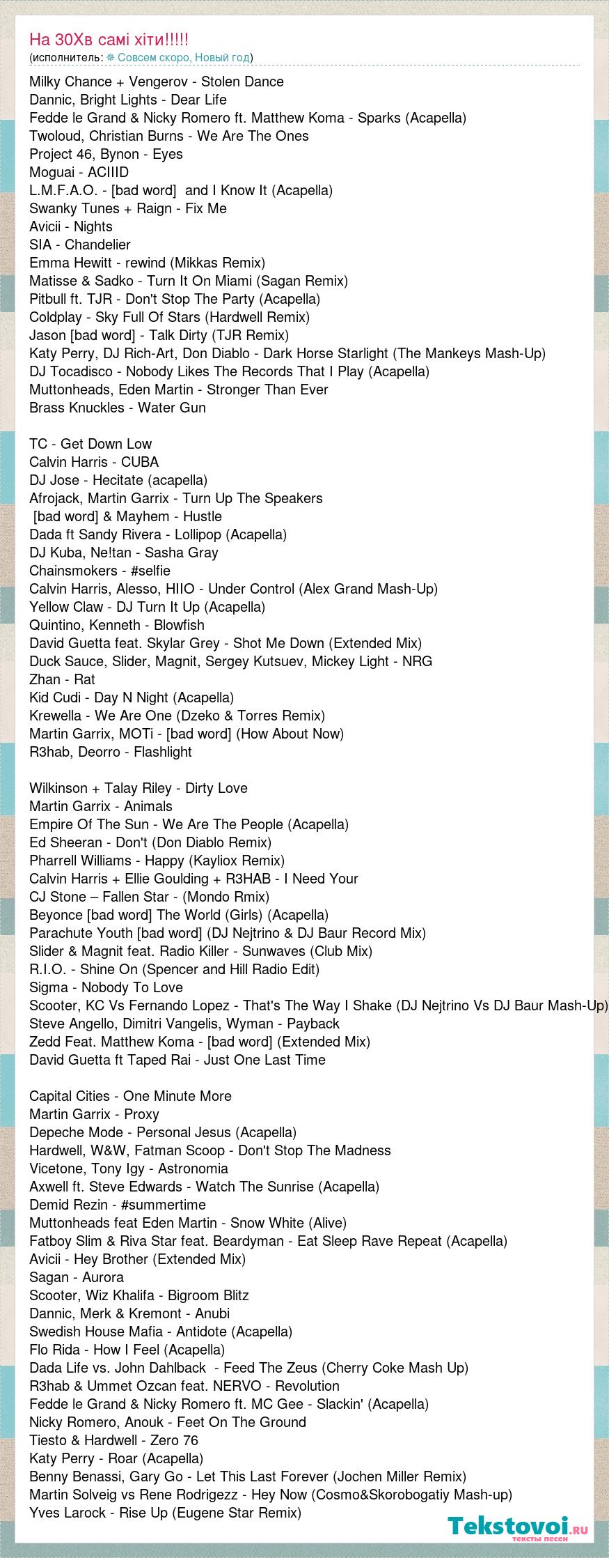 Milky Chance + Vengerov - Stolen Dance Dannic, Bright Lights - Dear Life Fedde le Grand & Nicky Romero ft. Matthew Koma - Sparks (Acapella) Twoloud, Christian Burns - We Are The Ones Project 46, Bynon - Eyes Moguai - ACIIID L.M.F.A.O. - [bad word] and I Know It (Acapella) Swanky Tunes + Raign - Fix Me Avicii - Nights SIA - Chandelier Emma Hewitt - rewind (Mikkas Remix) Matisse & Sadko - Turn It On Miami (Sagan Remix) Pitbull ft. TJR - Don't Stop The Party (Acapella) Coldplay - Sky Full Of Stars (Hardwell Remix) Jason [bad word] - Talk Dirty (TJR Remix) Katy Perry, DJ Rich-Art, Don Diablo - Dark Horse Starlight (The Mankeys Mash-Up) DJ Tocadisco - Nobody Likes The Records That I Play (Acapella) Muttonheads, Eden Martin - Stronger Than Ever Brass Knuckles - Water Gun TC - Get Down Low Calvin Harris - CUBA DJ Jose - Hecitate (acapella) Afrojack, Martin Garrix - Turn Up The Speakers [bad word] & Mayhem - Hustle Dada ft Sandy Rivera - Lollipop (Acapella) DJ Kuba, Ne!tan - Sasha Gray Chainsmokers - #selfie Calvin Harris, Alesso, HIIO - Under Control (Alex Grand Mash-Up) Yellow Claw - DJ Turn It Up (Acapella) Quintino, Kenneth - Blowfish David Guetta feat. Skylar Grey - Shot Me Down (Extended Mix) Duck Sauce, Slider, Magnit, Sergey Kutsuev, Mickey Light - NRG Zhan - Rat Kid Cudi - Day N Night (Acapella) Krewella - We Are One (Dzeko & Torres Remix) Martin Garrix, MOTi - [bad word] (How About Now) R3hab, Deorro - Flashlight Wilkinson + Talay Riley - Dirty Love Martin Garrix - Animals Empire Of The Sun - We Are The People (Acapella) Ed Sheeran - Don't (Don Diablo Remix) Pharrell Williams - Happy (Kayliox Remix) Calvin Harris + Ellie Goulding + R3HAB - I Need Your CJ Stone – Fallen Star - (Mondo Rmix) Beyonce [bad word] The World (Girls) (Acapella) Parachute Youth [bad word] (DJ Nejtrino & DJ Baur Record Mix) Slider & Magnit feat. Radio Killer - Sunwaves (Club Mix) R.I.O. - Shine On (Spencer and Hill Radio Edit) Sigma - Nobody To Love Scooter, KC Vs Fernando Lopez - That's The Way I Shake (DJ Nejtrino Vs DJ Baur Mash-Up) Steve Angello, Dimitri Vangelis, Wyman - Payback Zedd Feat. Matthew Koma - [bad word] (Extended Mix) David Guetta ft Taped Rai - Just One Last Time Capital Cities - One Minute More Martin Garrix - Proxy Depeche Mode - Personal Jesus (Acapella) Hardwell, W&W, Fatman Scoop - Don't Stop The Madness Vicetone, Tony Igy - Astronomia Axwell ft. Steve Edwards - Watch The Sunrise (Acapella) Demid Rezin - #summertime Muttonheads feat Eden Martin - Snow White (Alive) Fatboy Slim & Riva Star feat. Beardyman - Eat Sleep Rave Repeat (Acapella) Avicii - Hey Brother (Extended Mix) Sagan - Aurora Scooter, Wiz Khalifa - Bigroom Blitz Dannic, Merk & Kremont - Anubi Swedish House Mafia - Antidote (Acapella) Flo Rida - How I Feel (Acapella) Dada Life vs. John Dahlback - Feed The Zeus (Cherry Coke Mash Up) R3hab & Ummet Ozcan feat. NERVO - Revolution Fedde le Grand & Nicky Romero ft. MC Gee - Slackin' (Acapella) Nicky Romero, Anouk - Feet On The Ground Tiesto & Hardwell - Zero 76 Katy Perry - Roar (Acapella) Benny Benassi, Gary Go - Let This Last Forever (Jochen Miller Remix) Martin Solveig vs Rene Rodrigezz - Hey Now (Cosmo&Skorobogatiy Mash-up) Yves Larock - Rise Up (Eugene Star Remix)