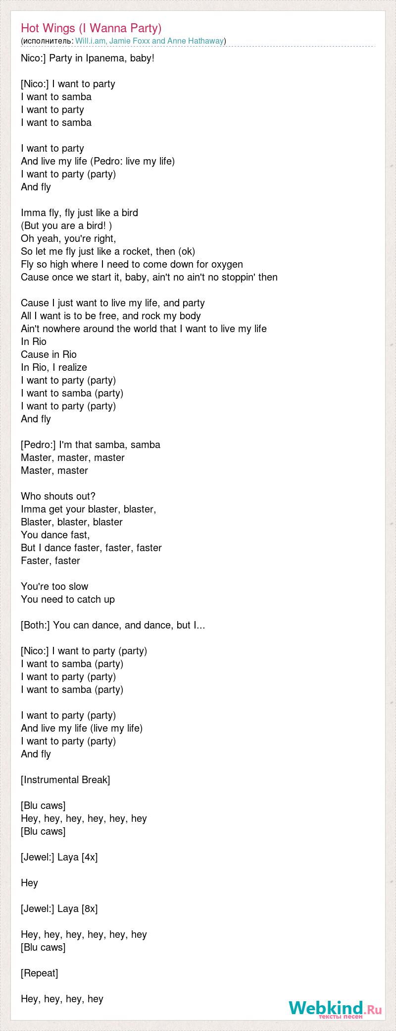 Nico:] Party in Ipanema, baby! [Nico:] I want to party I want to samba I want to party I want to samba I want to party And live my life (Pedro: live my life) I want to party (party) And fly Imma fly, fly just like a bird (But you are a bird! ) Oh yeah, you're right, So let me fly just like a rocket, then (ok) Fly so high where I need to come down for oxygen Cause once we start it, baby, ain't no ain't no stoppin' then Cause I just want to live my life, and party All I want is to be free, and rock my body Ain't nowhere around the world that I want to live my life In Rio Cause in Rio In Rio, I realize I want to party (party) I want to samba (party) I want to party (party) And fly [Pedro:] I'm that samba, samba Master, master, master Master, master Who shouts out? Imma get your blaster, blaster, Blaster, blaster, blaster You dance fast, But I dance faster, faster, faster Faster, faster You're too slow You need to catch up [Both:] You can dance, and dance, but I... [Nico:] I want to party (party) I want to samba (party) I want to party (party) I want to samba (party) I want to party (party) And live my life (live my life) I want to party (party) And fly [Instrumental Break] [Blu caws] Hey, hey, hey, hey, hey, hey [Blu caws] [Jewel:] Laya [4x] Hey [Jewel:] Laya [8x] Hey, hey, hey, hey, hey, hey [Blu caws] [Repeat] Hey, hey, hey, hey