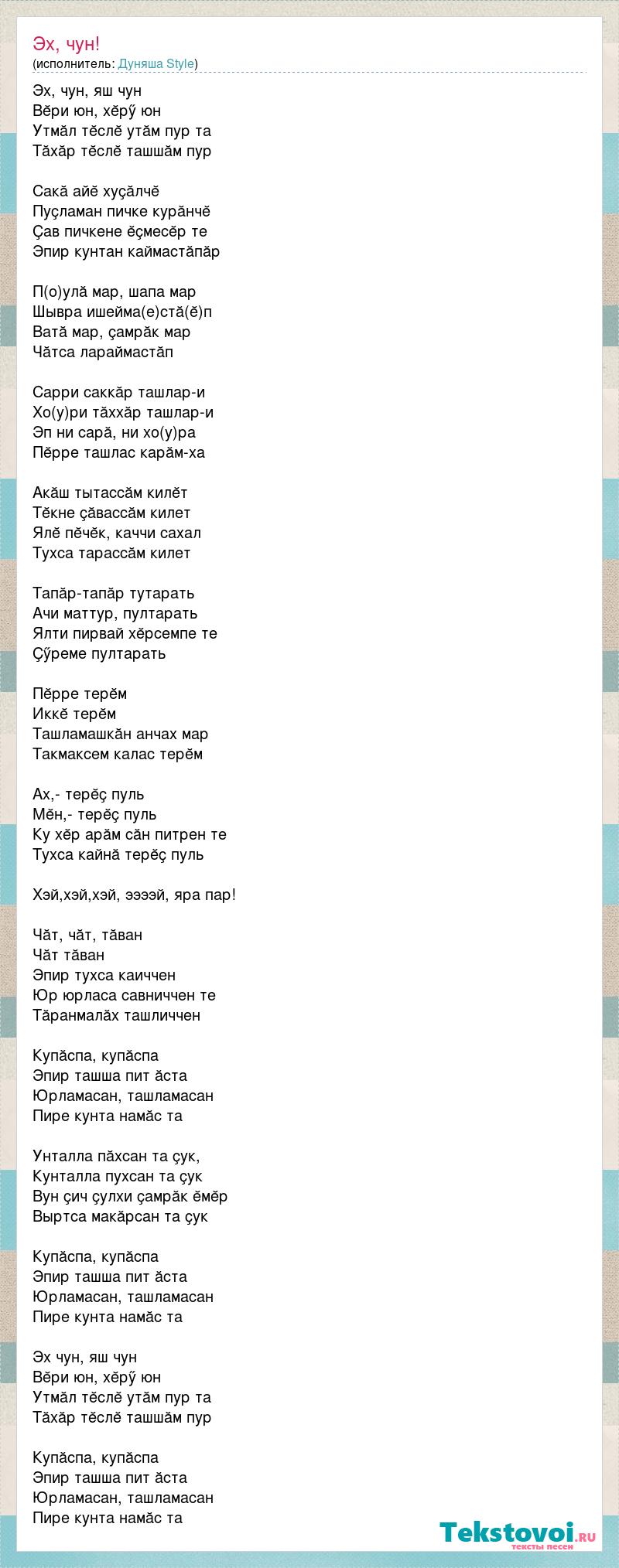 Эх, чун, яш чун Вӗри юн, хӗрӳ юн Утмӑл тӗслӗ утӑм пур та Тӑхӑр тӗслӗ ташшӑм пур Сакӑ айӗ хуҫӑлчӗ Пуҫламан пичке курӑнчӗ Ҫав пичкене ӗҫмесӗр те Эпир кунтан каймастӑпӑр П(о)улӑ мар, шапа мар Шывра ишейма(е)стӑ(ӗ)п Ватӑ мар, ҫамрӑк мар Чӑтса лараймастӑп Сарри саккӑр ташлар-и Хо(у)ри тӑххӑр ташлар-и Эп ни сарӑ, ни хо(у)ра Пӗрре ташлас карӑм-ха Акӑш тытассӑм килӗт Тӗкне ҫӑвассӑм килет Ялӗ пӗчӗк, каччи сахал Тухса тарассӑм килет Тапӑр-тапӑр тутарать Ачи маттур, пултарать Ялти пирвай хӗрсемпе те Ҫӳреме пултарать Пӗрре терӗм Иккӗ терӗм Ташламашкӑн анчах мар Такмаксем калас терӗм Ах,- терӗҫ пуль Мӗн,- терӗҫ пуль Ку хӗр арӑм сӑн питрен те Тухса кайнӑ терӗҫ пуль Хэй,хэй,хэй, ээээй, яра пар! Чӑт, чӑт, тӑван Чӑт тӑван Эпир тухса каиччен Юр юрласа савниччен те Тӑранмалӑх ташличчен Купӑспа, купӑспа Эпир ташша пит ӑста Юрламасан, ташламасан Пире кунта намӑс та Унталла пӑхсан та ҫук, Кунталла пухсан та ҫук Вун ҫич ҫулхи ҫамрӑк ӗмӗр Выртса макӑрсан та ҫук Купӑспа, купӑспа Эпир ташша пит ӑста Юрламасан, ташламасан Пире кунта намӑс та Эх чун, яш чун Вӗри юн, хӗрӳ юн Утмӑл тӗслӗ утӑм пур та Тӑхӑр тӗслӗ ташшӑм пур Купӑспа, купӑспа Эпир ташша пит ӑста Юрламасан, ташламасан Пире кунта намӑс та