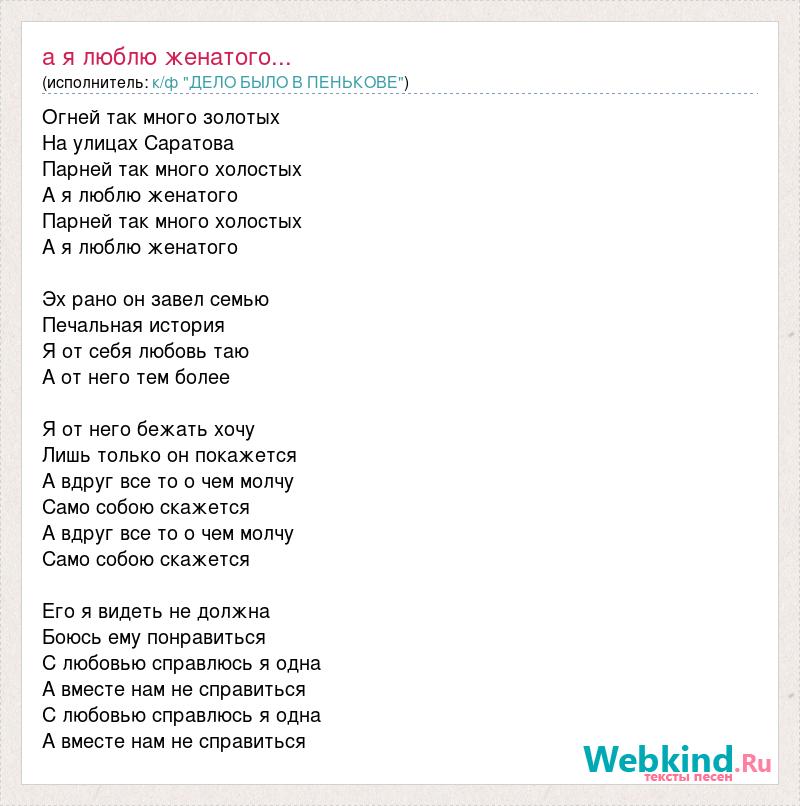 Огней так много золотых На улицах Саратова Парней так много холостых А я люблю женатого Парней так много холостых А я люблю женатого Эх рано он завел семью Печальная история Я от себя любовь таю А от него тем более Я от него бежать хочу Лишь только он покажется А вдруг все то о чем молчу Само собою скажется А вдруг все то о чем молчу Само собою скажется Его я видеть не должна Боюсь ему понравиться С любовью справлюсь я одна А вместе нам не справиться С любовью справлюсь я одна А вместе нам не справиться