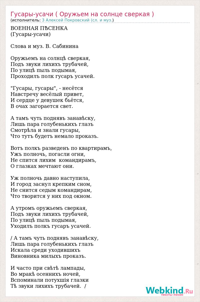 ВОЕННАЯ ПѢСЕНКА (Гусары-усачи) Слова и муз. В. Сабинина Оружьемъ на солнцѣ сверкая, Подъ звуки лихихъ трубачей, По улицѣ пыль подымая, Проходилъ полк гусаръ усачей. "Гусары, гусары", - несётся Навстречу весёлый привет, И сердце у девушек бьётся, В очах загорается свет. А тамъ чуть поднявъ занавѣску, Лишь пара голубенькихъ глазъ Смотрѣла и знали гусары, Что тутъ будетъ немало проказъ. Вотъ полкъ разведенъ по квартирамъ, Ужъ полночь, погасли огни, Не спится лихим командирамъ, О глазках мечтают они. Уж полночь давно наступила, И город заснул крепким сном, Не снится седым командирам, Что творится у них под окном. А утромъ оружьемъ сверкая, Подъ звуки лихихъ трубачей, По улицѣ пыль подымая, Уходилъ полкъ гусаръ усачей. / А тамъ чуть поднявъ занавѣску, Лишь пара голубенькихъ глазъ Искала среди уходившихъ Виновника милыхъ проказъ. И часто при свѣтѣ лампады, Во мракѣ осеннихъ ночей, Вспоминали потухшiя глазки Тѣ звуки лихихъ трубачей. /