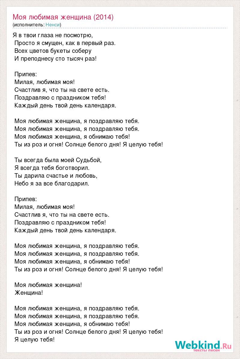 Я в твои глаза не посмотрю, Просто я смущен, как в первый раз. Всех цветов букеты соберу И преподнесу сто тысяч раз! Припев: Милая, любимая моя! Счастлив я, что ты на свете есть. Поздравляю с праздником тебя! Каждый день твой день календаря. Моя любимая женщина, я поздравляю тебя. Моя любимая женщина, я поздравляю тебя. Моя любимая женщина, я обнимаю тебя! Ты из роз и огня! Солнце белого дня! Я целую тебя! Ты всегда была моей Судьбой, Я всегда тебя боготворил. Ты дарила счастье и любовь, Небо я за все благодарил. Припев: Милая, любимая моя! Счастлив я, что ты на свете есть. Поздравляю с праздником тебя! Каждый день твой день календаря. Моя любимая женщина, я поздравляю тебя. Моя любимая женщина, я поздравляю тебя. Моя любимая женщина, я обнимаю тебя! Ты из роз и огня! Солнце белого дня! Я целую тебя! Моя любимая женщина! Женщина! Моя любимая женщина, я поздравляю тебя. Моя любимая женщина, я поздравляю тебя. Моя любимая женщина, я обнимаю тебя! Ты из роз и огня! Солнце белого дня! Я целую тебя! Я целую тебя!