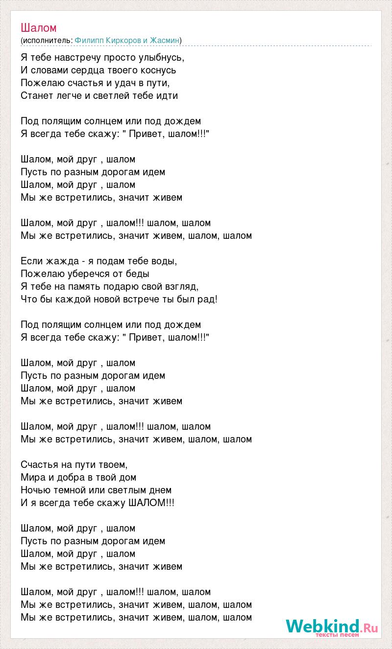 Я тебе навстречу просто улыбнусь, И словами сердца твоего коснусь Пожелаю счастья и удач в пути, Станет легче и светлей тебе идти Под полящим солнцем или под дождем Я всегда тебе скажу: " Привет, шалом!!!" Шалом, мой друг , шалом Пусть по разным дорогам идем Шалом, мой друг , шалом Мы же встретились, значит живем Шалом, мой друг , шалом!!! шалом, шалом Мы же встретились, значит живем, шалом, шалом Если жажда - я подам тебе воды, Пожелаю уберечся от беды Я тебе на память подарю свой взгляд, Что бы каждой новой встрече ты был рад! Под полящим солнцем или под дождем Я всегда тебе скажу: " Привет, шалом!!!" Шалом, мой друг , шалом Пусть по разным дорогам идем Шалом, мой друг , шалом Мы же встретились, значит живем Шалом, мой друг , шалом!!! шалом, шалом Мы же встретились, значит живем, шалом, шалом Счастья на пути твоем, Мира и добра в твой дом Ночью темной или светлым днем И я всегда тебе скажу ШАЛОМ!!! Шалом, мой друг , шалом Пусть по разным дорогам идем Шалом, мой друг , шалом Мы же встретились, значит живем Шалом, мой друг , шалом!!! шалом, шалом Мы же встретились, значит живем, шалом, шалом Мы же встретились, значит живем, шалом, шалом