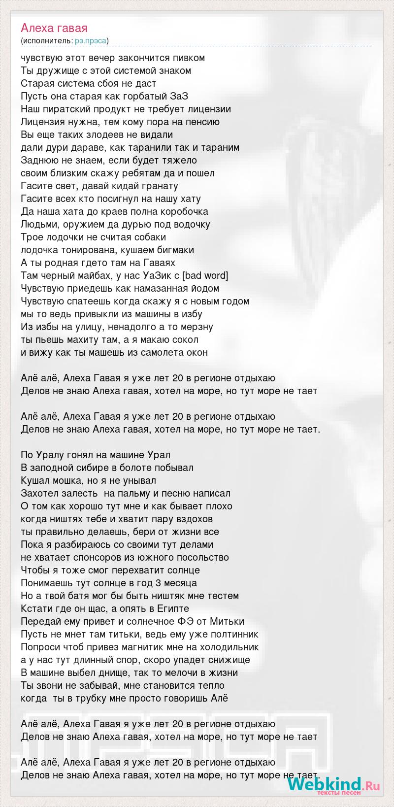 чувствую этот вечер закончится пивком Ты дружище с этой системой знаком Старая система сбоя не даст Пусть она старая как горбатый ЗаЗ Наш пиратский продукт не требует лицензии Лицензия нужна, тем кому пора на пенсию Вы еще таких злодеев не видали дали дури дараве, как таранили так и тараним Заднюю не знаем, если будет тяжело своим близким скажу ребятам да и пошел Гасите свет, давай кидай гранату Гасите всех кто посигнул на нашу хату Да наша хата до краев полна коробочка Людьми, оружием да дурью под водочку Трое лодочки не считая собаки лодочка тонирована, кушаем бигмаки А ты родная гдето там на Гаваях Там черный майбах, у нас УаЗик с [bad word] Чувствую приедешь как намазанная йодом Чувствую спатеешь когда скажу я с новым годом мы то ведь привыкли из машины в избу Из избы на улицу, ненадолго а то мерзну ты пьешь махиту там, а я макаю сокол и вижу как ты машешь из самолета окон Алё алё, Алеха Гавая я уже лет 20 в регионе отдыхаю Делов не знаю Алеха гавая, хотел на море, но тут море не тает Алё алё, Алеха Гавая я уже лет 20 в регионе отдыхаю Делов не знаю Алеха гавая, хотел на море, но тут море не тает. По Уралу гонял на машине Урал В заподной сибире в болоте побывал Кушал мошка, но я не унывал Захотел залесть на пальму и песню написал О том как хорошо тут мне и как бывает плохо когда ништях тебе и хватит пару вздохов ты правильно делаешь, бери от жизни все Пока я разбираюсь со своими тут делами не хватает спонсоров из южного посольство Чтобы я тоже смог перехватит солнце Понимаешь тут солнце в год 3 месяца Но а твой батя мог бы быть ништяк мне тестем Кстати где он щас, а опять в Египте Передай ему привет и солнечное ФЭ от Митьки Пусть не мнет там титьки, ведь ему уже полтинник Попроси чтоб привез магнитик мне на холодильник а у нас тут длинный спор, скоро упадет снижище В машине выбел днище, так то мелочи в жизни Ты звони не забывай, мне становится тепло когда ты в трубку мне просто говоришь Алё Алё алё, Алеха Гавая я уже лет 20 в регионе отдыхаю Делов не знаю Алеха гавая, хотел на море, но тут море не тает Алё алё, Алеха Гавая я уже лет 20 в регионе отдыхаю Делов не знаю Алеха гавая, хотел на море, но тут море не тает.