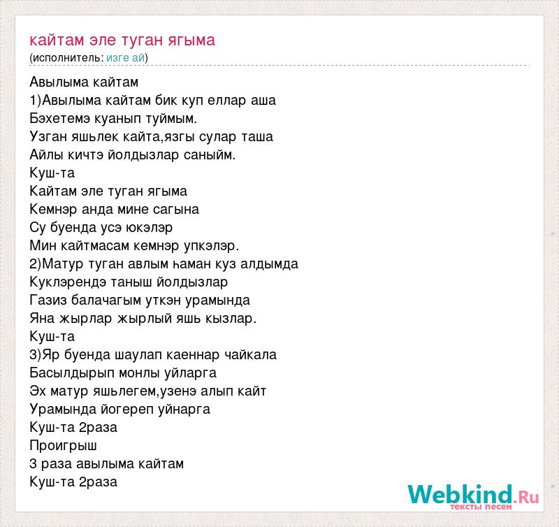 Авылыма кайтам 1)Авылыма кайтам бик куп еллар аша Бэхетемэ куанып туймым. Узган яшьлек кайта,язгы сулар таша Айлы кичтэ йолдызлар саныйм. Куш-та Кайтам эле туган ягыма Кемнэр анда мине сагына Су буенда усэ юкэлэр Мин кайтмасам кемнэр упкэлэр. 2)Матур туган авлым һаман куз алдымда Куклэрендэ таныш йолдызлар Газиз балачагым уткэн урамында Яна жырлар жырлый яшь кызлар. Куш-та 3)Яр буенда шаулап каеннар чайкала Басылдырып монлы уйларга Эх матур яшьлегем,узенэ алып кайт Урамында йогереп уйнарга Куш-та 2раза Проигрыш 3 раза авылыма кайтам Куш-та 2раза