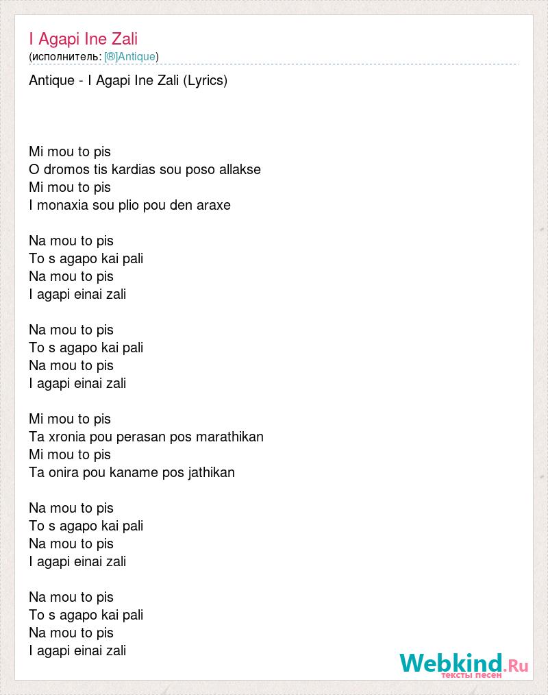 Antique - I Agapi Ine Zali (Lyrics) Mi mou to pis O dromos tis kardias sou poso allakse Mi mou to pis I monaxia sou plio pou den araxe Na mou to pis To s agapo kai pali Na mou to pis I agapi einai zali Na mou to pis To s agapo kai pali Na mou to pis I agapi einai zali Mi mou to pis Ta xronia pou perasan pos marathikan Mi mou to pis Ta onira pou kaname pos jathikan Na mou to pis To s agapo kai pali Na mou to pis I agapi einai zali Na mou to pis To s agapo kai pali Na mou to pis I agapi einai zali