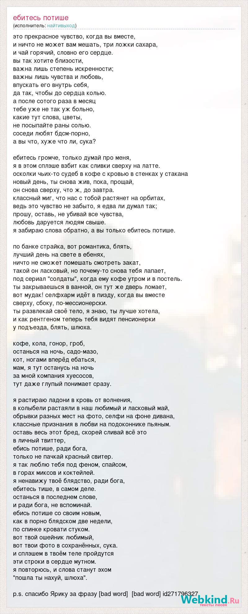 это прекрасное чувство, когда вы вместе, и ничто не может вам мешать, три ложки сахара, и чай горячий, словно его сердце. вы так хотите близости, важна лишь степень искренности; важны лишь чувства и любовь, впускать его внутрь себя, да так, чтобы до сердца колью. а после сотого раза в месяц тебе уже не так уж больно, какие тут слова, цветы, не посыпайте раны солью. соседи любят бдсм-порно, а вы что, хуже что ли, сука? ебитесь громче, только думай про меня, я в этом сплэше взбит как сливки сверху на латте. осколки чьих-то судеб в кофе с кровью в стенках у стакана новый день, ты снова жив, пока, прощай, он снова сверху, что ж, до завтра. классный миг, что нас с тобой растянет на орбитах, ведь это чувство не забыто, я едва ли думал так; прошу, оставь, не убивай все чувства, любовь даруется людям свыше. я забираю слова обратно, а вы только ебитесь потише. по банке страйка, вот романтика, блять, лучший день на свете в ебенях, ничто не сможет помешать смотреть закат, такой он ласковый, но почему-то снова тебя лапает, под сериал "солдаты", когда ему кофе утром и в постель. ты закрываешься в ванной, он тут же дверь ломает, вот мудак! селфхарм идёт в пизду, когда вы вместе сверху, сбоку, по-мессионерски. ты развлекай своё тело, я знаю, ты лучше хотела, и как рентгеном теперь тебя видят пенсионерки у подъезда, блять, шлюха. кофе, кола, гонор, гроб, останься на ночь, садо-мазо, кот, ногами вперёд ебаться, мам, я тут останусь на ночь за мной компания хуесосов, тут даже глупый понимает сразу. я растираю ладони в кровь от волнения, в колыбели растаяли в наш любимый и ласковый май, обрывки разных мест на фото, селфи на фоне дивана, классные признания в любви на подоконнике пьяным. оставь весь этот бред, скорей сливай всё это в личный твиттер, ебись потише, ради бога, только не пачкай красный свитер. я так люблю тебя под феном, спайсом, в горах миксов и коктейлей. я ненавижу твоё блядство, ради бога, ебитесь тише, в самом деле. останься в последнем слове, и ради бога, не вспоминай. ебись потише со своим новым, как в порно блядском две недели, по спинке кровати стуком. вот твой ошейник любимый, вот твои фото в сохранённых, сука. и сплэшем в твоём теле пройдутся эти строки в сердце мутном. я повторюсь, и слова станут эхом "пошла ты нахуй, шлюха". p.s. спасибо Ярику за фразу [bad word] [bad word] id271796327