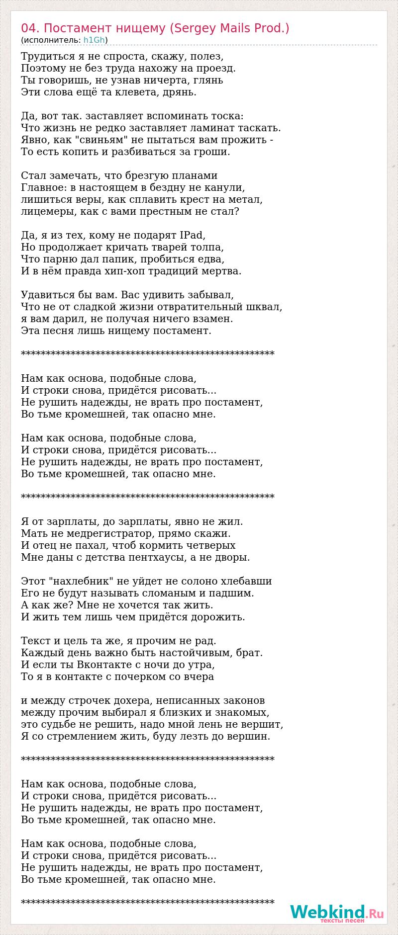 Трудиться я не спроста, скажу, полез, Поэтому не без труда нахожу на проезд. Ты говоришь, не узнав ничерта, глянь Эти слова ещё та клевета, дрянь. Да, вот так. заставляет вспоминать тоска: Что жизнь не редко заставляет ламинат таскать. Явно, как "свиньям" не пытаться вам прожить - То есть копить и разбиваться за гроши. Стал замечать, что брезгую планами Главное: в настоящем в бездну не канули, лишиться веры, как сплавить крест на метал, лицемеры, как с вами престным не стал? Да, я из тех, кому не подарят IPad, Но продолжает кричать тварей толпа, Что парню дал папик, пробиться едва, И в нём правда хип-хоп традиций мертва. Удавиться бы вам. Вас удивить забывал, Что не от сладкой жизни отвратительный шквал, я вам дарил, не получая ничего взамен. Эта песня лишь нищему постамент. *************************************************** Нам как основа, подобные слова, И строки снова, придётся рисовать... Не рушить надежды, не врать про постамент, Во тьме кромешней, так опасно мне. Нам как основа, подобные слова, И строки снова, придётся рисовать... Не рушить надежды, не врать про постамент, Во тьме кромешней, так опасно мне. *************************************************** Я от зарплаты, до зарплаты, явно не жил. Мать не медрегистратор, прямо скажи. И отец не пахал, чтоб кормить четверых Мне даны с детства пентхаусы, а не дворы. Этот "нахлебник" не уйдет не солоно хлебавши Его не будут называть сломаным и падшим. А как же? Мне не хочется так жить. И жить тем лишь чем придётся дорожить. Текст и цель та же, я прочим не рад. Каждый день важно быть настойчивым, брат. И если ты Вконтакте с ночи до утра, То я в контакте с почерком со вчера и между строчек дохера, неписанных законов между прочим выбирал я близких и знакомых, это судьбе не решить, надо мной лень не вершит, Я со стремлением жить, буду лезть до вершин. *************************************************** Нам как основа, подобные слова, И строки снова, придётся рисовать... Не рушить надежды, не врать про постамент, Во тьме кромешней, так опасно мне. Нам как основа, подобные слова, И строки снова, придётся рисовать... Не рушить надежды, не врать про постамент, Во тьме кромешней, так опасно мне. ***************************************************
