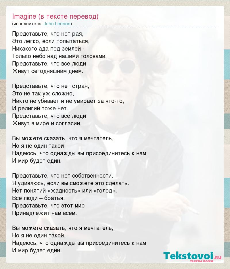 Представьте, что нет рая, Это легко, если попытаться, Никакого ада под землей - Только небо над нашими головами. Представьте, что все люди Живут сегодняшним днем. Представьте, что нет стран, Это не так уж сложно, Никто не убивает и не умирает за что-то, И религий тоже нет. Представьте, что все люди Живут в мире и согласии. Вы можете сказать, что я мечтатель, Но я не один такой Надеюсь, что однажды вы присоединитесь к нам И мир будет един. Представьте, что нет собственности. Я удивлюсь, если вы сможете это сделать. Нет понятий «жадность» или «голод», Все люди – братья. Представьте, что этот мир Принадлежит нам всем. Вы можете сказать, что я мечтатель, Но я не один такой. Надеюсь, что однажды вы присоединитесь к нам И мир будет един.