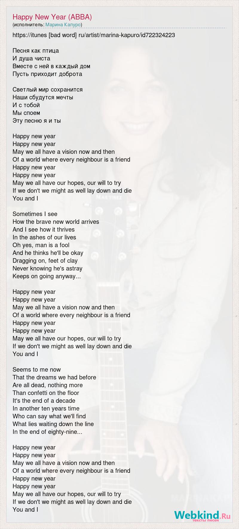 https://itunes [bad word] ru/artist/marina-kapuro/id722324223 Песня как птица И душа чиста Вместе с ней в каждый дом Пусть приходит доброта Светлый мир сохранится Наши сбудутся мечты И с тобой Мы споем Эту песню я и ты Happy new year Happy new year May we all have a vision now and then Of a world where every neighbour is a friend Happy new year Happy new year May we all have our hopes, our will to try If we don't we might as well lay down and die You and I Sometimes I see How the brave new world arrives And I see how it thrives In the ashes of our lives Oh yes, man is a fool And he thinks he'll be okay Dragging on, feet of clay Never knowing he's astray Keeps on going anyway... Happy new year Happy new year May we all have a vision now and then Of a world where every neighbour is a friend Happy new year Happy new year May we all have our hopes, our will to try If we don't we might as well lay down and die You and I Seems to me now That the dreams we had before Are all dead, nothing more Than confetti on the floor It's the end of a decade In another ten years time Who can say what we'll find What lies waiting down the line In the end of eighty-nine... Happy new year Happy new year May we all have a vision now and then Of a world where every neighbour is a friend Happy new year Happy new year May we all have our hopes, our will to try If we don't we might as well lay down and die You and I
