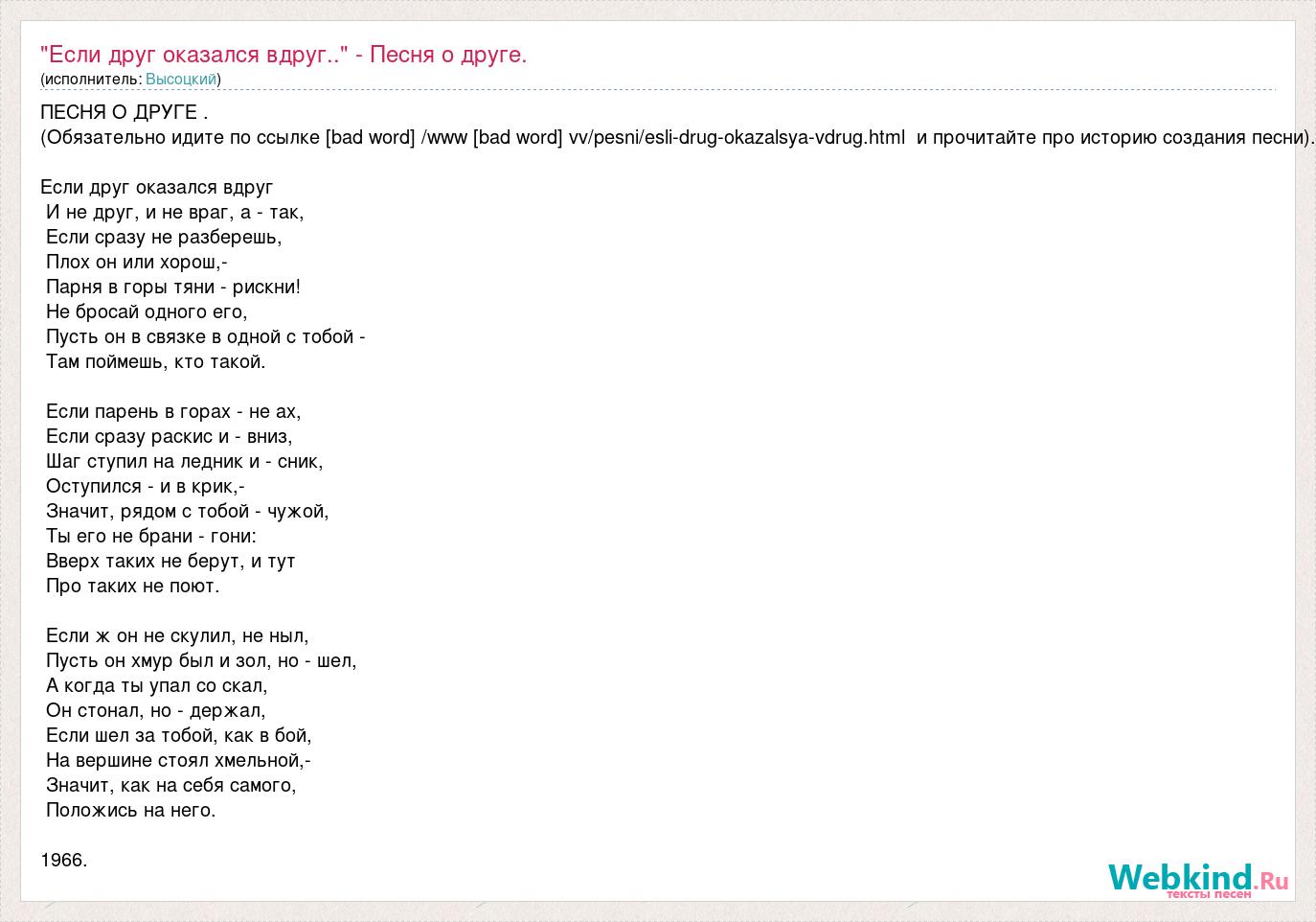 ПЕСНЯ О ДРУГЕ . (Обязательно идите по ссылке [bad word] /www [bad word] vv/pesni/esli-drug-okazalsya-vdrug.html и прочитайте про историю создания песни). Если друг оказался вдруг И не друг, и не враг, а - так, Если сразу не разберешь, Плох он или хорош,- Парня в горы тяни - рискни! Не бросай одного его, Пусть он в связке в одной с тобой - Там поймешь, кто такой. Если парень в горах - не ах, Если сразу раскис и - вниз, Шаг ступил на ледник и - сник, Оступился - и в крик,- Значит, рядом с тобой - чужой, Ты его не брани - гони: Вверх таких не берут, и тут Про таких не поют. Если ж он не скулил, не ныл, Пусть он хмур был и зол, но - шел, А когда ты упал со скал, Он стонал, но - держал, Если шел за тобой, как в бой, На вершине стоял хмельной,- Значит, как на себя самого, Положись на него. 1966.