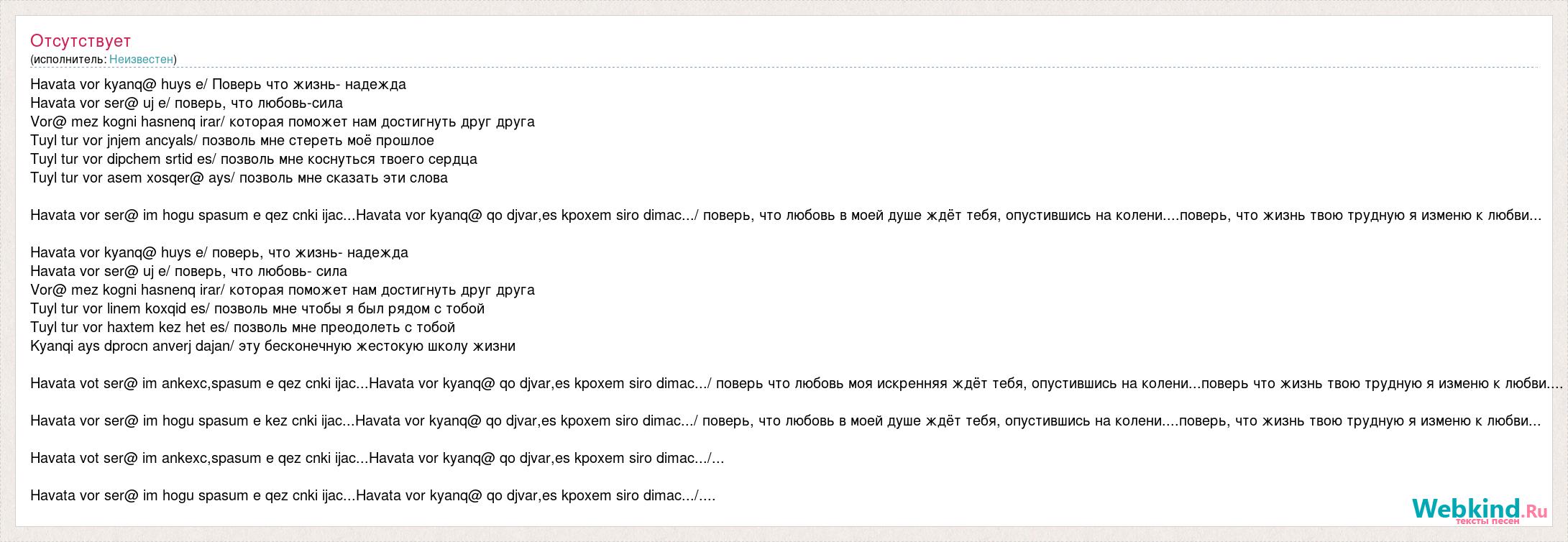 Havata vor kyanq@ huys e/ Поверь что жизнь- надежда Havata vor ser@ uj e/ поверь, что любовь-сила Vor@ mez kogni hasnenq irar/ которая поможет нам достигнуть друг друга Tuyl tur vor jnjem ancyals/ позволь мне стереть моё прошлое Tuyl tur vor dipchem srtid es/ позволь мне коснуться твоего сердца Tuyl tur vor asem xosqer@ ays/ позволь мне сказать эти слова Havata vor ser@ im hogu spasum e qez cnki ijac...Havata vor kyanq@ qo djvar,es kpoxem siro dimac.../ поверь, что любовь в моей душе ждёт тебя, опустившись на колени....поверь, что жизнь твою трудную я изменю к любви... Havata vor kyanq@ huys e/ поверь, что жизнь- надежда Havata vor ser@ uj e/ поверь, что любовь- сила Vor@ mez kogni hasnenq irar/ которая поможет нам достигнуть друг друга Tuyl tur vor linem koxqid es/ позволь мне чтобы я был рядом с тобой Tuyl tur vor haxtem kez het es/ позволь мне преодолеть с тобой Kyanqi ays dprocn anverj dajan/ эту бесконечную жестокую школу жизни Havata vot ser@ im ankexc,spasum e qez cnki ijac...Havata vor kyanq@ qo djvar,es kpoxem siro dimac.../ поверь что любовь моя искренняя ждёт тебя, опустившись на колени...поверь что жизнь твою трудную я изменю к любви.... Havata vor ser@ im hogu spasum e kez cnki ijac...Havata vor kyanq@ qo djvar,es kpoxem siro dimac.../ поверь, что любовь в моей душе ждёт тебя, опустившись на колени....поверь, что жизнь твою трудную я изменю к любви... Havata vot ser@ im ankexc,spasum e qez cnki ijac...Havata vor kyanq@ qo djvar,es kpoxem siro dimac.../... Havata vor ser@ im hogu spasum e qez cnki ijac...Havata vor kyanq@ qo djvar,es kpoxem siro dimac.../....
