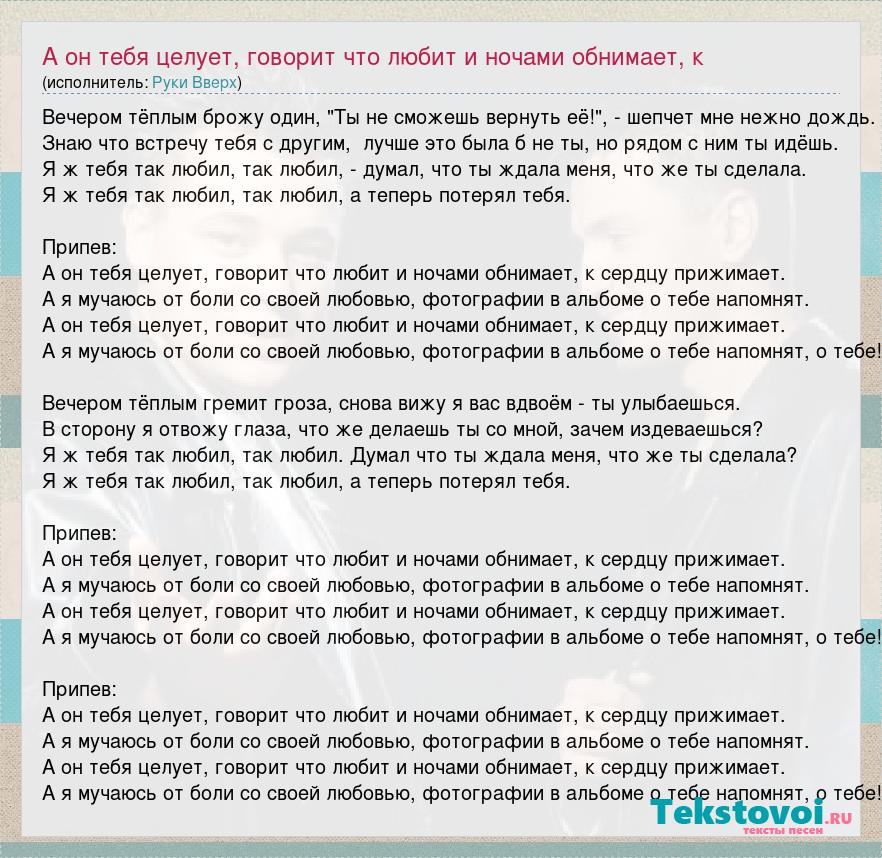 Главная→Исполнители→Руки Вверх→А он тебя целует, говорит что любит и ночами обнимает, к сердцу прижимает. А я