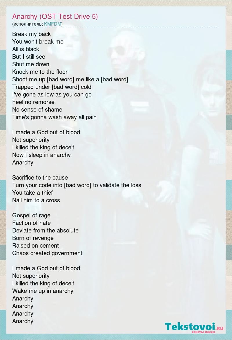 Break my back You won't break me All is black But I still see Shut me down Knock me to the floor Shoot me up [bad word] me like a [bad word] Trapped under ice Comfortably cold I've gone as low as you can go Feel no remorse No sense of shame Time's gonna wash away all pain I made a God out of blood Not superiority I killed the king of deceit Now I sleep in anarchy Anarchy Sacrifice to the cause Turn your code into law Compensate to validate the loss You take a thief Nail him to a cross Gospel of rage Faction of hate Deviate from the absolute Born of revenge Raised on cement Chaos created government I made a God out of blood Not superiority I killed the king of deceit Wake me up in anarchy Anarchy Anarchy Anarchy Anarchy