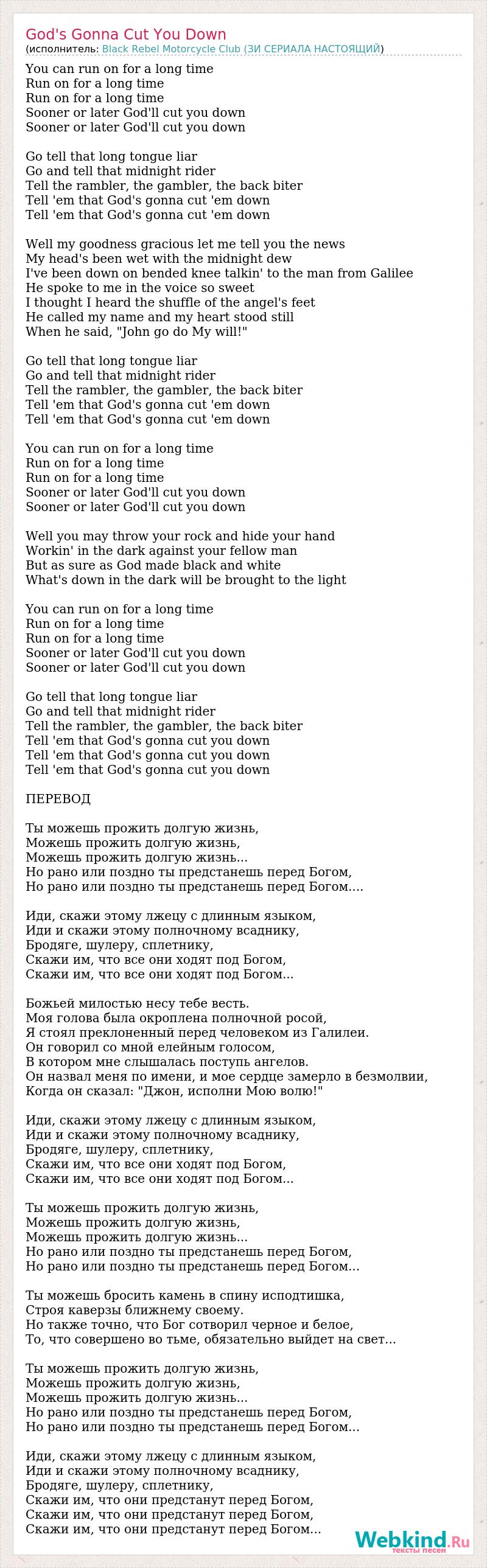You can run on for a long time Run on for a long time Run on for a long time Sooner or later God'll cut you down Sooner or later God'll cut you down Go tell that long tongue liar Go and tell that midnight rider Tell the rambler, the gambler, the back biter Tell 'em that God's gonna cut 'em down Tell 'em that God's gonna cut 'em down Well my goodness gracious let me tell you the news My head's been wet with the midnight dew I've been down on bended knee talkin' to the man from Galilee He spoke to me in the voice so sweet I thought I heard the shuffle of the angel's feet He called my name and my heart stood still When he said, "John go do My will!" Go tell that long tongue liar Go and tell that midnight rider Tell the rambler, the gambler, the back biter Tell 'em that God's gonna cut 'em down Tell 'em that God's gonna cut 'em down You can run on for a long time Run on for a long time Run on for a long time Sooner or later God'll cut you down Sooner or later God'll cut you down Well you may throw your rock and hide your hand Workin' in the dark against your fellow man But as sure as God made black and white What's down in the dark will be brought to the light You can run on for a long time Run on for a long time Run on for a long time Sooner or later God'll cut you down Sooner or later God'll cut you down Go tell that long tongue liar Go and tell that midnight rider Tell the rambler, the gambler, the back biter Tell 'em that God's gonna cut you down Tell 'em that God's gonna cut you down Tell 'em that God's gonna cut you down ПЕРЕВОД Ты можешь прожить долгую жизнь, Можешь прожить долгую жизнь, Можешь прожить долгую жизнь... Но рано или поздно ты предстанешь перед Богом, Но рано или поздно ты предстанешь перед Богом.... Иди, скажи этому лжецу с длинным языком, Иди и скажи этому полночному всаднику, Бродяге, шулеру, сплетнику, Скажи им, что все они ходят под Богом, Скажи им, что все они ходят под Богом... Божьей милостью несу тебе весть. Моя голова была окроплена полночной росой, Я стоял преклоненный перед человеком из Галилеи. Он говорил со мной елейным голосом, В котором мне слышалась поступь ангелов. Он назвал меня по имени, и мое сердце замерло в безмолвии, Когда он сказал: "Джон, исполни Мою волю!" Иди, скажи этому лжецу с длинным языком, Иди и скажи этому полночному всаднику, Бродяге, шулеру, сплетнику, Скажи им, что все они ходят под Богом, Скажи им, что все они ходят под Богом... Ты можешь прожить долгую жизнь, Можешь прожить долгую жизнь, Можешь прожить долгую жизнь... Но рано или поздно ты предстанешь перед Богом, Но рано или поздно ты предстанешь перед Богом... Ты можешь бросить камень в спину исподтишка, Строя каверзы ближнему своему. Но также точно, что Бог сотворил черное и белое, То, что совершено во тьме, обязательно выйдет на свет... Ты можешь прожить долгую жизнь, Можешь прожить долгую жизнь, Можешь прожить долгую жизнь... Но рано или поздно ты предстанешь перед Богом, Но рано или поздно ты предстанешь перед Богом... Иди, скажи этому лжецу с длинным языком, Иди и скажи этому полночному всаднику, Бродяге, шулеру, сплетнику, Скажи им, что они предстанут перед Богом, Скажи им, что они предстанут перед Богом, Скажи им, что они предстанут перед Богом...