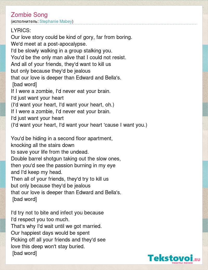 LYRICS: Our love story could be kind of gory, far from boring. We'd meet at a post-apocalypse. I'd be slowly walking in a group stalking you. You'd be the only man alive that I could not resist. And all of your friends, they'd want to kill us but only because they'd be jealous that our love is deeper than Edward and Bella's. CHORUS: If I were a zombie, I'd never eat your brain. I'd just want your heart (I'd want your heart, I'd want your heart, oh.) If I were a zombie, I'd never eat your brain. I'd just want your heart (I'd want your heart, I'd want your heart 'cause I want you.) You'd be hiding in a second floor apartment, knocking all the stairs down to save your life from the undead. Double barrel shotgun taking out the slow ones, then you'd see the passion burning in my eye and I'd keep my head. Then all of your friends, they'd try to kill us but only because they'd be jealous that our love is deeper than Edward and Bella's. (CHORUS) I'd try not to bite and infect you because I'd respect you too much. That's why I'd wait until we got married. Our happiest days would be spent Picking off all your friends and they'd see love this deep won't stay buried. (CHORUS)
