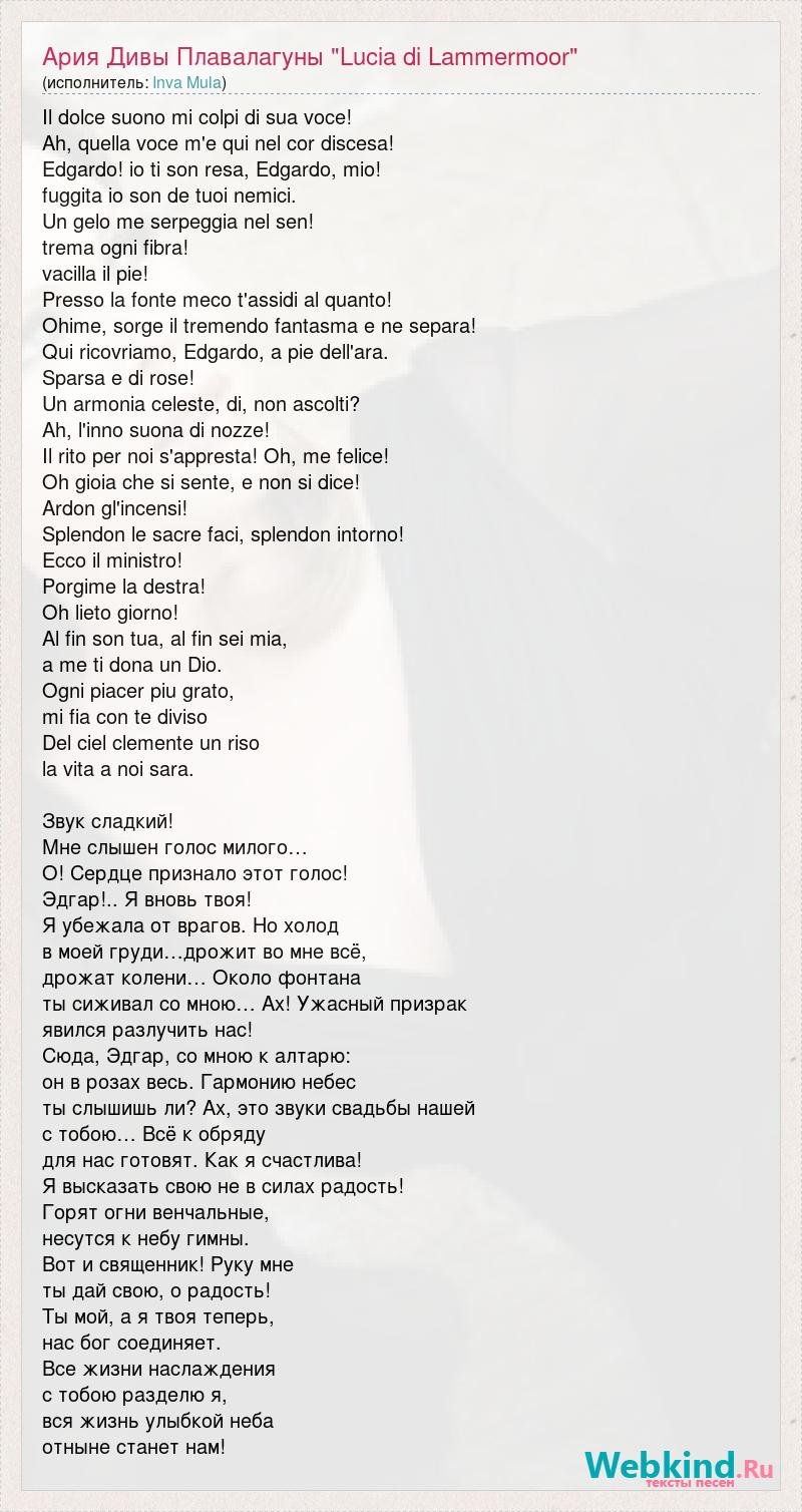 Il dolce suono mi colpi di sua voce! Ah, quella voce m'e qui nel cor discesa! Edgardo! io ti son resa, Edgardo, mio! fuggita io son de tuoi nemici. Un gelo me serpeggia nel sen! trema ogni fibra! vacilla il pie! Presso la fonte meco t'assidi al quanto! Ohime, sorge il tremendo fantasma e ne separa! Qui ricovriamo, Edgardo, a pie dell'ara. Sparsa e di rose! Un armonia celeste, di, non ascolti? Ah, l'inno suona di nozze! Il rito per noi s'appresta! Oh, me felice! Oh gioia che si sente, e non si dice! Ardon gl'incensi! Splendon le sacre faci, splendon intorno! Ecco il ministro! Porgime la destra! Oh lieto giorno! Al fin son tua, al fin sei mia, a me ti dona un Dio. Ogni piacer piu grato, mi fia con te diviso Del ciel clemente un riso la vita a noi sara. Звук сладкий! Мне слышен голос милого… О! Сердце признало этот голос! Эдгар!.. Я вновь твоя! Я убежала от врагов. Но холод в моей груди…дрожит во мне всё, дрожат колени… Около фонтана ты сиживал со мною… Ах! Ужасный призрак явился разлучить нас! Сюда, Эдгар, со мною к алтарю: он в розах весь. Гармонию небес ты слышишь ли? Ах, это звуки свадьбы нашей с тобою… Всё к обряду для нас готовят. Как я счастлива! Я высказать свою не в силах радость! Горят огни венчальные, несутся к небу гимны. Вот и священник! Руку мне ты дай свою, о радость! Ты мой, а я твоя теперь, нас бог соединяет. Все жизни наслаждения с тобою разделю я, вся жизнь улыбкой неба отныне станет нам!