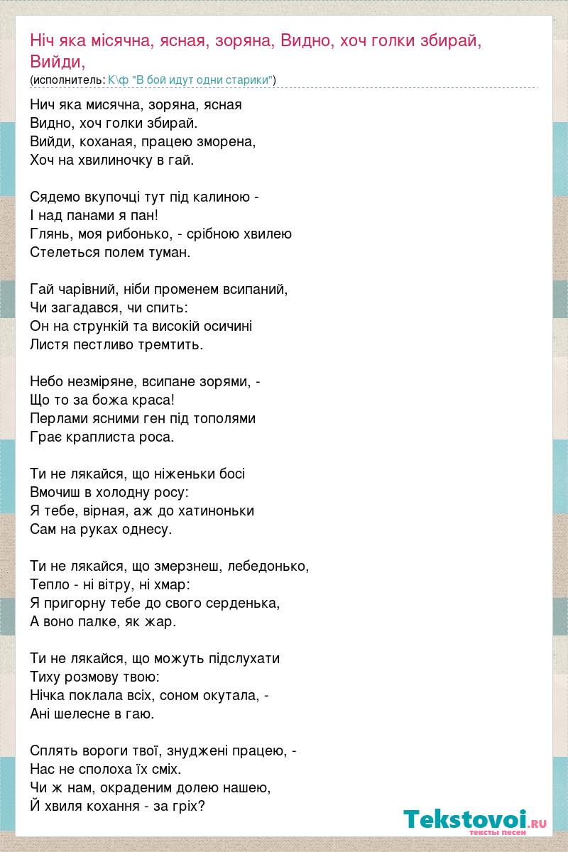 Нич яка мисячна, зоряна, ясная Видно, хоч голки збирай. Вийди, коханая, працею зморена, Хоч на хвилиночку в гай. Сядемо вкупочцi тут пiд калиною - I над панами я пан! Глянь, моя рибонько, - срiбною хвилею Стелеться полем туман. Гай чарiвний, нiби променем всипаний, Чи загадався, чи спить: Он на стрункiй та високiй осичинi Листя пестливо тремтить. Небо незмiряне, всипане зорями, - Що то за божа краса! Перлами ясними ген пiд тополями Грає краплиста роса. Ти не лякайся, що нiженьки босi Вмочиш в холодну росу: Я тебе, вiрная, аж до хатиноньки Сам на руках однесу. Ти не лякайся, що змерзнеш, лебедонько, Тепло - нi вiтру, нi хмар: Я пригорну тебе до свого серденька, А воно палке, як жар. Ти не лякайся, що можуть пiдслухати Тиху розмову твою: Нiчка поклала всiх, соном окутала, - Анi шелесне в гаю. Сплять вороги твої, знудженi працею, - Нас не сполоха їх смiх. Чи ж нам, окраденим долею нашею, Й хвиля кохання - за грiх?