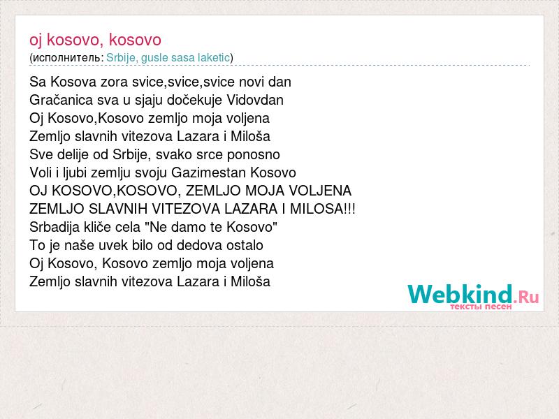 Sa Kosova zora svice,svice,svice novi dan Gračanica sva u sjaju dočekuje Vidovdan Oj Kosovo,Kosovo zemljo moja voljena Zemljo slavnih vitezova Lazara i Miloša Sve delije od Srbije, svako srce ponosno Voli i ljubi zemlju svoju Gazimestan Kosovo OJ KOSOVO,KOSOVO, ZEMLJO MOJA VOLJENA ZEMLJO SLAVNIH VITEZOVA LAZARA I MILOSA!!! Srbadija kliče cela "Ne damo te Kosovo" To je naše uvek bilo od dedova ostalo Oj Kosovo, Kosovo zemljo moja voljena Zemljo slavnih vitezova Lazara i Miloša