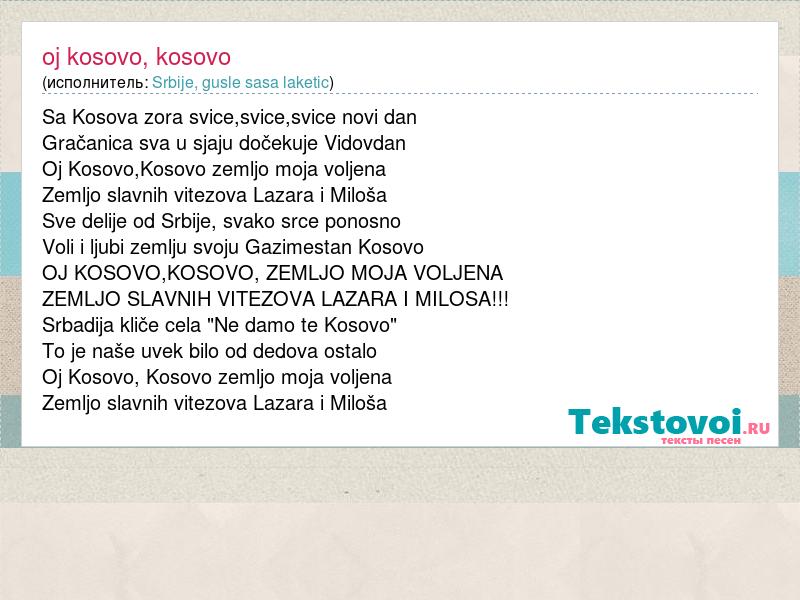 Sa Kosova zora svice,svice,svice novi dan Gračanica sva u sjaju dočekuje Vidovdan Oj Kosovo,Kosovo zemljo moja voljena Zemljo slavnih vitezova Lazara i Miloša Sve delije od Srbije, svako srce ponosno Voli i ljubi zemlju svoju Gazimestan Kosovo OJ KOSOVO,KOSOVO, ZEMLJO MOJA VOLJENA ZEMLJO SLAVNIH VITEZOVA LAZARA I MILOSA!!! Srbadija kliče cela "Ne damo te Kosovo" To je naše uvek bilo od dedova ostalo Oj Kosovo, Kosovo zemljo moja voljena Zemljo slavnih vitezova Lazara i Miloša