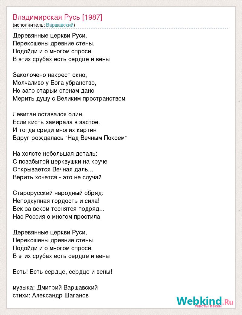Деревянные церкви Руси, Перекошены древние стены. Подойди и о многом спроси, В этих срубах есть сердце и вены Заколочено накрест окно, Молчаливо у Бога убранство, Но зато старым стенам дано Мерить душу с Великим пространством Левитан оставался один, Если кисть замирала в застое. И тогда среди многих картин Вдруг рождалась "Над Вечным Покоем" На холсте небольшая деталь: С позабытой церквушки на круче Открывается Вечная даль... Верить хочется - это не случай Старорусский народный обряд: Неподкупная гордость и сила! Век за веком теснятся подряд... Нас Россия о многом простила Деревянные церкви Руси, Перекошены древние стены. Подойди и о многом спроси, В этих срубах есть сердце и вены Есть! Есть сердце, сердце и вены! музыка: Дмитрий Варшавский стихи: Александр Шаганов