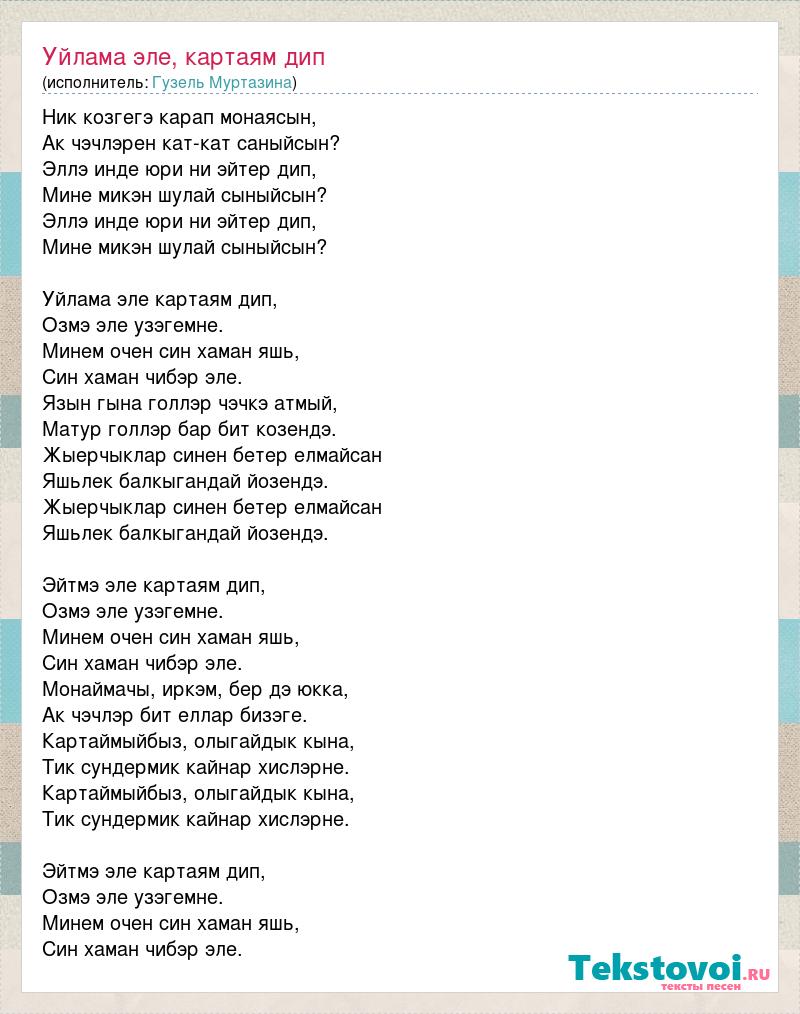 Ник козгегэ карап монаясын, Ак чэчлэрен кат-кат саныйсын? Эллэ инде юри ни эйтер дип, Мине микэн шулай сыныйсын? Эллэ инде юри ни эйтер дип, Мине микэн шулай сыныйсын? Уйлама эле картаям дип, Озмэ эле узэгемне. Минем очен син хаман яшь, Син хаман чибэр эле. Язын гына голлэр чэчкэ атмый, Матур голлэр бар бит козендэ. Жыерчыклар синен бетер елмайсан Яшьлек балкыгандай йозендэ. Жыерчыклар синен бетер елмайсан Яшьлек балкыгандай йозендэ. Эйтмэ эле картаям дип, Озмэ эле узэгемне. Минем очен син хаман яшь, Син хаман чибэр эле. Монаймачы, иркэм, бер дэ юкка, Ак чэчлэр бит еллар бизэге. Картаймыйбыз, олыгайдык кына, Тик сундермик кайнар хислэрне. Картаймыйбыз, олыгайдык кына, Тик сундермик кайнар хислэрне. Эйтмэ эле картаям дип, Озмэ эле узэгемне. Минем очен син хаман яшь, Син хаман чибэр эле.
