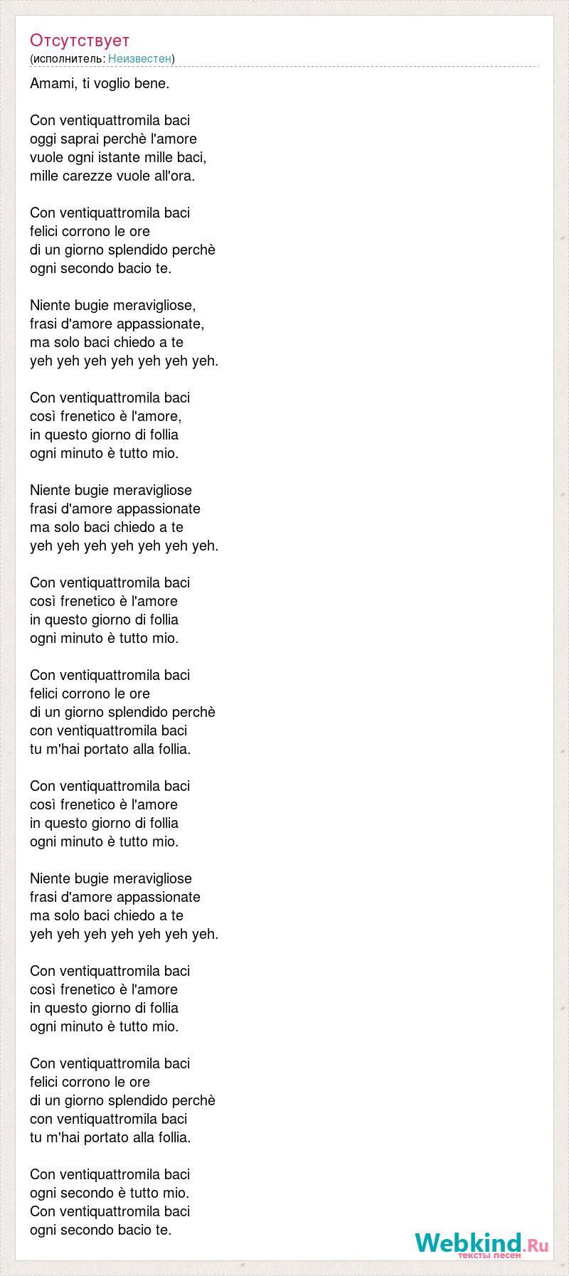 Amami, ti voglio bene. Con ventiquattromila baci oggi saprai perchè l'amore vuole ogni istante mille baci, mille carezze vuole all'ora. Con ventiquattromila baci felici corrono le ore di un giorno splendido perchè ogni secondo bacio te. Niente bugie meravigliose, frasi d'amore appassionate, ma solo baci chiedo a te yeh yeh yeh yeh yeh yeh yeh. Con ventiquattromila baci così frenetico è l'amore, in questo giorno di follia ogni minuto è tutto mio. Niente bugie meravigliose frasi d'amore appassionate ma solo baci chiedo a te yeh yeh yeh yeh yeh yeh yeh. Con ventiquattromila baci così frenetico è l'amore in questo giorno di follia ogni minuto è tutto mio. Con ventiquattromila baci felici corrono le ore di un giorno splendido perchè con ventiquattromila baci tu m'hai portato alla follia. Con ventiquattromila baci così frenetico è l'amore in questo giorno di follia ogni minuto è tutto mio. Niente bugie meravigliose frasi d'amore appassionate ma solo baci chiedo a te yeh yeh yeh yeh yeh yeh yeh. Con ventiquattromila baci così frenetico è l'amore in questo giorno di follia ogni minuto è tutto mio. Con ventiquattromila baci felici corrono le ore di un giorno splendido perchè con ventiquattromila baci tu m'hai portato alla follia. Con ventiquattromila baci ogni secondo è tutto mio. Con ventiquattromila baci ogni secondo bacio te.