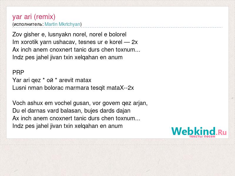 Zov gisher e, lusnyakn norel, norel e bolorel Im xorotik yarn ushacav, tesnes ur e korel — 2x Ax inch anem cnoxnert tanic durs chen toxnum... Indz pes jahel jivan txin xelqahan en anum PRP Yar ari qez * ой * arevit matax Lusni nman bolorac marmara tesqit mataX--2x Voch ashux em vochel gusan, vor govem qez arjan, Du el darnas vard balasan, bujes dards dajan Ax inch anem cnoxnert tanic durs chen toxnum... Indz pes jahel jivan txin xelqahan en anum