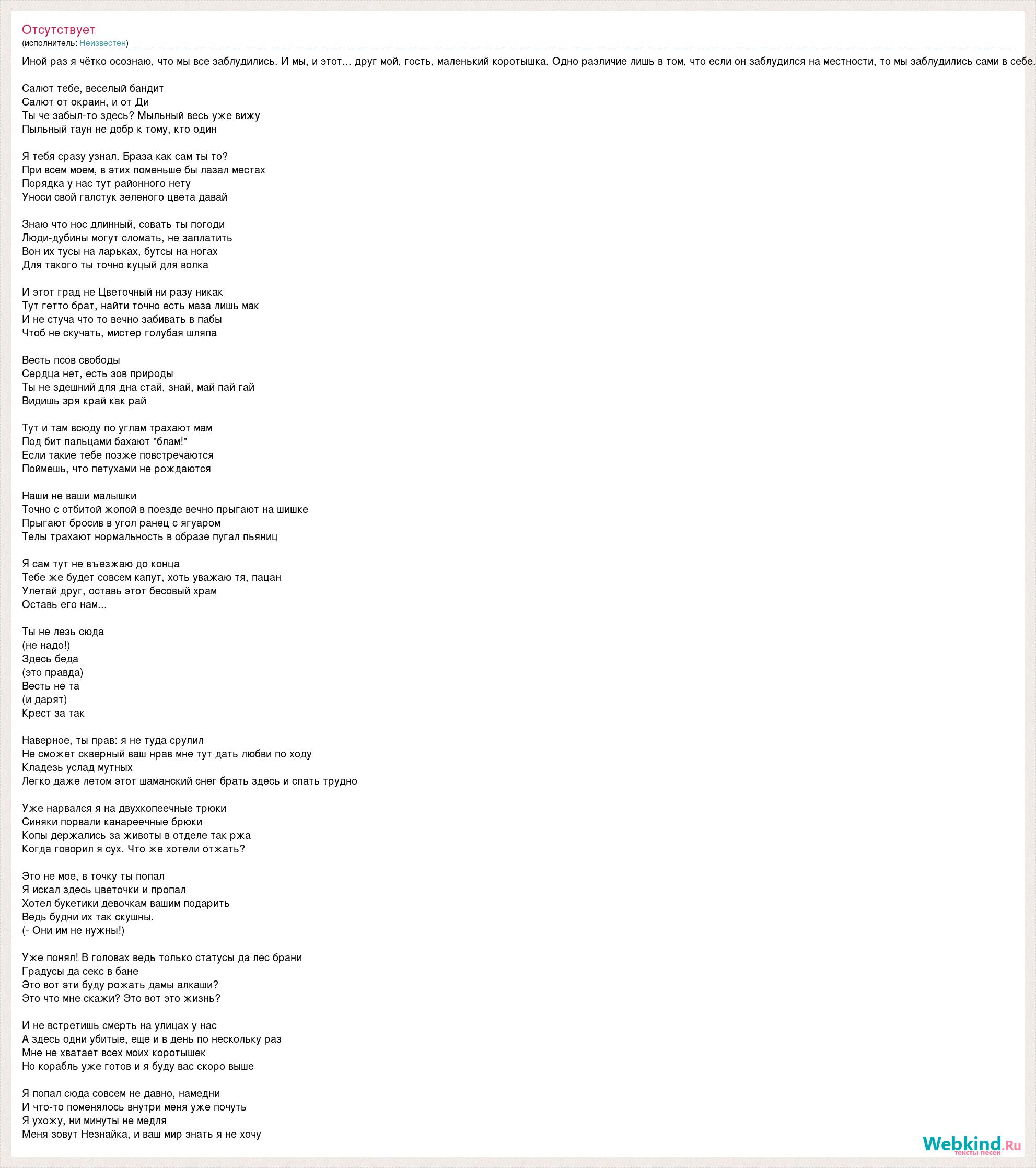 Иной раз я чётко осознаю, что мы все заблудились. И мы, и этот... друг мой, гость, маленький коротышка. Одно различие лишь в том, что если он заблудился на местности, то мы заблудились сами в себе. Салют тебе, веселый бандит Салют от окраин, и от Ди Ты че забыл-то здесь? Мыльный весь уже вижу Пыльный таун не добр к тому, кто один Я тебя сразу узнал. Браза как сам ты то? При всем моем, в этих поменьше бы лазал местах Порядка у нас тут районного нету Уноси свой галстук зеленого цвета давай Знаю что нос длинный, совать ты погоди Люди-дубины могут сломать, не заплатить Вон их тусы на ларьках, бутсы на ногах Для такого ты точно куцый для волка И этот град не Цветочный ни разу никак Тут гетто брат, найти точно есть маза лишь мак И не стуча что то вечно забивать в пабы Чтоб не скучать, мистер голубая шляпа Весть псов свободы Сердца нет, есть зов природы Ты не здешний для дна стай, знай, май пай гай Видишь зря край как рай Тут и там всюду по углам трахают мам Под бит пальцами бахают "блам!" Если такие тебе позже повстречаются Поймешь, что петухами не рождаются Наши не ваши малышки Точно с отбитой жопой в поезде вечно прыгают на шишке Прыгают бросив в угол ранец с ягуаром Телы трахают нормальность в образе пугал пьяниц Я сам тут не въезжаю до конца Тебе же будет совсем капут, хоть уважаю тя, пацан Улетай друг, оставь этот бесовый храм Оставь его нам... Ты не лезь сюда (не надо!) Здесь беда (это правда) Весть не та (и дарят) Крест за так Наверное, ты прав: я не туда срулил Не сможет скверный ваш нрав мне тут дать любви по ходу Кладезь услад мутных Легко даже летом этот шаманский снег брать здесь и спать трудно Уже нарвался я на двухкопеечные трюки Синяки порвали канареечные брюки Копы держались за животы в отделе так ржа Когда говорил я сух. Что же хотели отжать? Это не мое, в точку ты попал Я искал здесь цветочки и пропал Хотел букетики девочкам вашим подарить Ведь будни их так скушны. (- Они им не нужны!) Уже понял! В головах ведь только статусы да лес брани Градусы да секс в бане Это вот эти буду рожать дамы алкаши? Это что мне скажи? Это вот это жизнь? И не встретишь смерть на улицах у нас А здесь одни убитые, еще и в день по нескольку раз Мне не хватает всех моих коротышек Но корабль уже готов и я буду вас скоро выше Я попал сюда совсем не давно, намедни И что-то поменялось внутри меня уже почуть Я ухожу, ни минуты не медля Меня зовут Незнайка, и ваш мир знать я не хочу