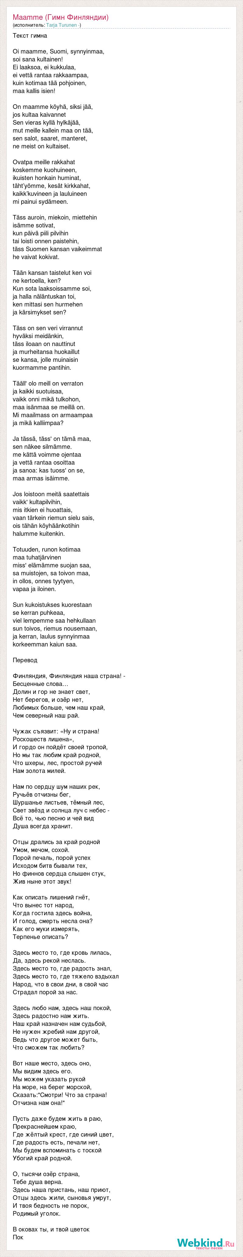 Текст гимна Oi maamme, Suomi, synnyinmaa, soi sana kultainen! Ei laaksoa, ei kukkulaa, ei vettä rantaa rakkaampaa, kuin kotimaa tää pohjoinen, maa kallis isien! On maamme köyhä, siksi jää, jos kultaa kaivannet Sen vieras kyllä hylkäjää, mut meille kallein maa on tää, sen salot, saaret, manteret, ne meist on kultaiset. Ovatpa meille rakkahat koskemme kuohuineen, ikuisten honkain huminat, täht’yömme, kesät kirkkahat, kaikk’kuvineen ja lauluineen mi painui sydämeen. Täss auroin, miekoin, miettehin isämme sotivat, kun päivä piili pilvihin tai loisti onnen paistehin, täss Suomen kansan vaikeimmat he vaivat kokivat. Tään kansan taistelut ken voi ne kertoella, ken? Kun sota laaksoissamme soi, ja halla näläntuskan toi, ken mittasi sen hurmehen ja kärsimykset sen? Täss on sen veri virrannut hyväksi meidänkin, täss iloaan on nauttinut ja murheitansa huokaillut se kansa, jolle muinaisin kuormamme pantihin. Tääll' olo meill on verraton ja kaikki suotuisaa, vaikk onni mikä tulkohon, maa isänmaa se meillä on. Mi maailmass on armaampaa ja mikä kalliimpaa? Ja tässä, täss' on tämä maa, sen näkee silmämme. me kättä voimme ojentaa ja vettä rantaa osoittaa ja sanoa: kas tuoss' on se, maa armas isäimme. Jos loistoon meitä saatettais vaikk' kultapilvihin, mis itkien ei huoattais, vaan tärkein riemun sielu sais, ois tähän köyhäänkotihin halumme kuitenkin. Totuuden, runon kotimaa maa tuhatjärvinen miss' elämämme suojan saa, sa muistojen, sa toivon maa, in ollos, onnes tyytyen, vapaa ja iloinen. Sun kukoistukses kuorestaan se kerran puhkeaa, viel lempemme saa hehkullaan sun toivos, riemus nousemaan, ja kerran, laulus synnyinmaa korkeemman kaiun saa. Перевод Финляндия, Финляндия наша страна! - Бесценные слова… Долин и гор не знает свет, Нет берегов, и озёр нет, Любимых больше, чем наш край, Чем северный наш рай. Чужак съязвит: «Ну и страна! Роскошеств лишена», И гордо он пойдёт своей тропой, Но мы так любим край родной, Что шхеры, лес, простой ручей Нам золота милей. Нам по сердцу шум наших рек, Ручьёв отчизны бег, Шуршанье листьев, тёмный лес, Свет звёзд и солнца луч с небес - Всё то, чью песню и чей вид Душа всегда хранит. Отцы дрались за край родной Умом, мечом, сохой. Порой печаль, порой успех Исходом битв бывали тех, Но финнов сердца слышен стук, Жив ныне этот звук! Как описать лишений гнёт, Что вынес тот народ, Когда гостила здесь война, И голод, смерть несла она? Как его муки измерять, Терпенье описать? Здесь место то, где кровь лилась, Да, здесь рекой неслась. Здесь место то, где радость знал, Здесь место то, где тяжело вздыхал Народ, что в свои дни, в свой час Страдал порой за нас. Здесь любо нам, здесь наш покой, Здесь радостно нам жить. Наш край назначен нам судьбой, Не нужен жребий нам другой, Ведь что другое может быть, Что сможем так любить? Вот наше место, здесь оно, Мы видим здесь его. Мы можем указать рукой На море, на берег морской, Сказать:"Смотри! Что за страна! Отчизна нам она!" Пусть даже будем жить в раю, Прекраснейшем краю, Где жёлтый крест, где синий цвет, Где радость есть, печали нет, Мы будем вспоминать с тоской Убогий край родной. О, тысячи озёр страна, Тебе душа верна. Здесь наша пристань, наш приют, Отцы здесь жили, сыновья умрут, И твоя бедность не порок, Родимый уголок. В оковах ты, и твой цветок Пок