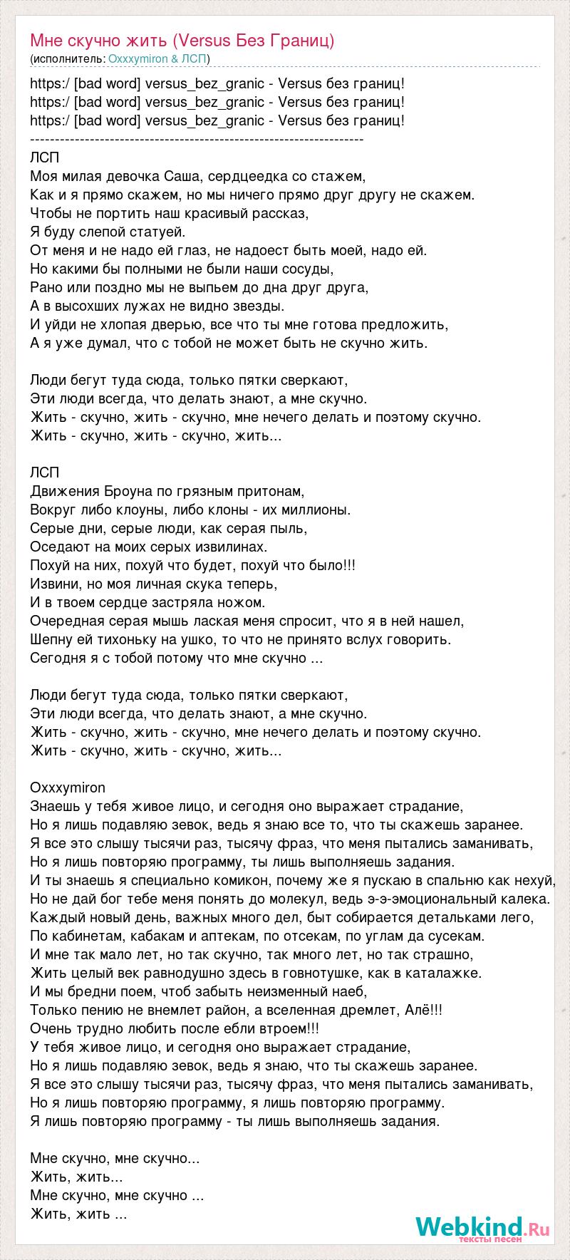 https:/ [bad word] versus_bez_granic - Versus без границ! https:/ [bad word] versus_bez_granic - Versus без границ! https:/ [bad word] versus_bez_granic - Versus без границ! ------------------------------------------------------------------- ЛСП Моя милая девочка Саша, сердцеедка со стажем, Как и я прямо скажем, но мы ничего прямо друг другу не скажем. Чтобы не портить наш красивый рассказ, Я буду слепой статуей. От меня и не надо ей глаз, не надоест быть моей, надо ей. Но какими бы полными не были наши сосуды, Рано или поздно мы не выпьем до дна друг друга, А в высохших лужах не видно звезды. И уйди не хлопая дверью, все что ты мне готова предложить, А я уже думал, что с тобой не может быть не скучно жить. Люди бегут туда сюда, только пятки сверкают, Эти люди всегда, что делать знают, а мне скучно. Жить - скучно, жить - скучно, мне нечего делать и поэтому скучно. Жить - скучно, жить - скучно, жить... ЛСП Движения Броуна по грязным притонам, Вокруг либо клоуны, либо клоны - их миллионы. Серые дни, серые люди, как серая пыль, Оседают на моих серых извилинах. Похуй на них, похуй что будет, похуй что было!!! Извини, но моя личная скука теперь, И в твоем сердце застряла ножом. Очередная серая мышь лаская меня спросит, что я в ней нашел, Шепну ей тихоньку на ушко, то что не принято вслух говорить. Сегодня я с тобой потому что мне скучно ... Люди бегут туда сюда, только пятки сверкают, Эти люди всегда, что делать знают, а мне скучно. Жить - скучно, жить - скучно, мне нечего делать и поэтому скучно. Жить - скучно, жить - скучно, жить... Oxxxymiron Знаешь у тебя живое лицо, и сегодня оно выражает страдание, Но я лишь подавляю зевок, ведь я знаю все то, что ты скажешь заранее. Я все это слышу тысячи раз, тысячу фраз, что меня пытались заманивать, Но я лишь повторяю программу, ты лишь выполняешь задания. И ты знаешь я специально комикон, почему же я пускаю в спальню как нехуй, Но не дай бог тебе меня понять до молекул, ведь э-э-эмоциональный калека. Каждый новый день, важных много дел, быт собирается детальками лего, По кабинетам, кабакам и аптекам, по отсекам, по углам да сусекам. И мне так мало лет, но так скучно, так много лет, но так страшно, Жить целый век равнодушно здесь в говнотушке, как в каталажке. И мы бредни поем, чтоб забыть неизменный наеб, Только пению не внемлет район, а вселенная дремлет, Алё!!! Очень трудно любить после ебли втроем!!! У тебя живое лицо, и сегодня оно выражает страдание, Но я лишь подавляю зевок, ведь я знаю, что ты скажешь заранее. Я все это слышу тысячи раз, тысячу фраз, что меня пытались заманивать, Но я лишь повторяю программу, я лишь повторяю программу. Я лишь повторяю программу - ты лишь выполняешь задания. Мне скучно, мне скучно... Жить, жить... Мне скучно, мне скучно ... Жить, жить ...