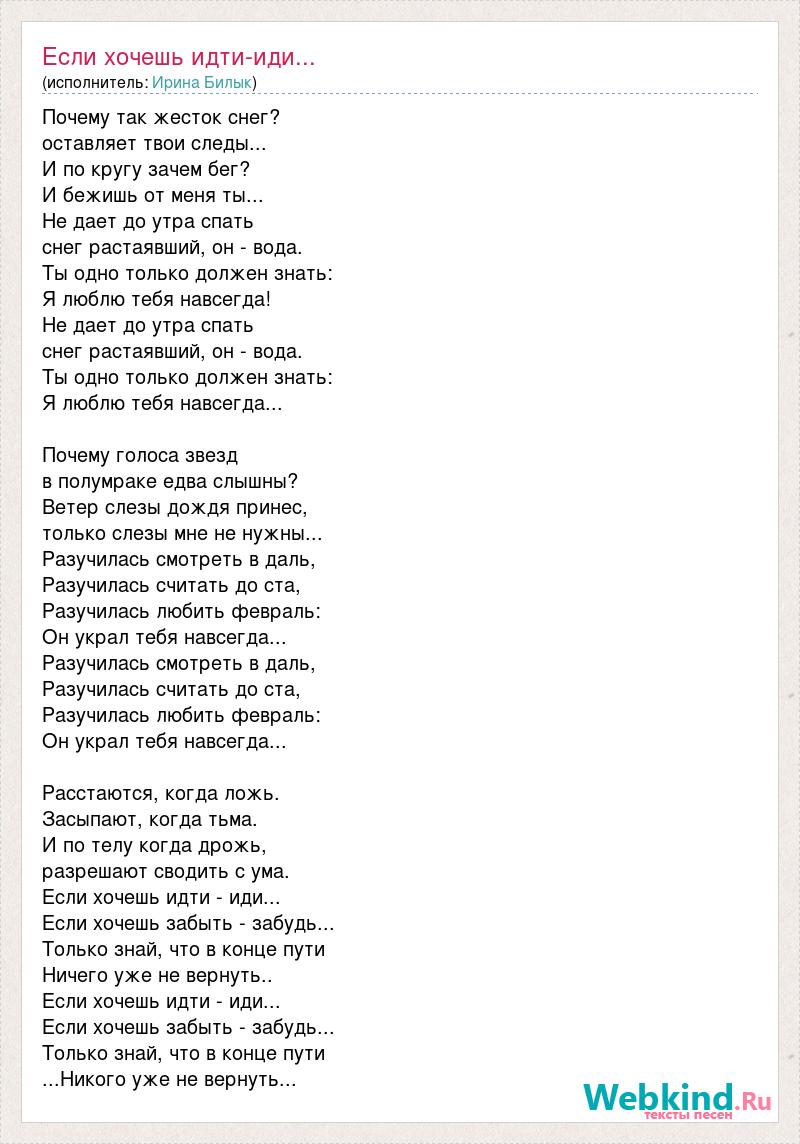 Почему так жесток снег? оставляет твои следы... И по кругу зачем бег? И бежишь от меня ты... Не дает до утра спать снег растаявший, он - вода. Ты одно только должен знать: Я люблю тебя навсегда! Не дает до утра спать снег растаявший, он - вода. Ты одно только должен знать: Я люблю тебя навсегда... Почему голоса звезд в полумраке едва слышны? Ветер слезы дождя принес, только слезы мне не нужны... Разучилась смотреть в даль, Разучилась считать до ста, Разучилась любить февраль: Он украл тебя навсегда... Разучилась смотреть в даль, Разучилась считать до ста, Разучилась любить февраль: Он украл тебя навсегда... Расстаются, когда ложь. Засыпают, когда тьма. И по телу когда дрожь, разрешают сводить с ума. Если хочешь идти - иди... Если хочешь забыть - забудь... Только знай, что в конце пути Ничего уже не вернуть.. Если хочешь идти - иди... Если хочешь забыть - забудь... Только знай, что в конце пути ...Никого уже не вернуть...